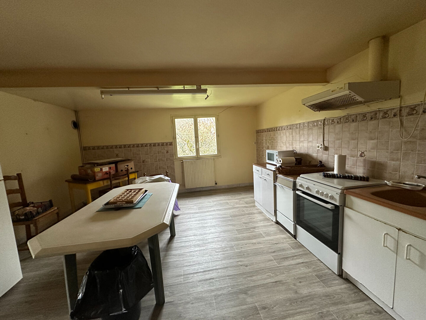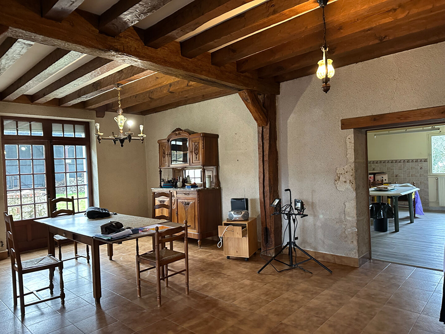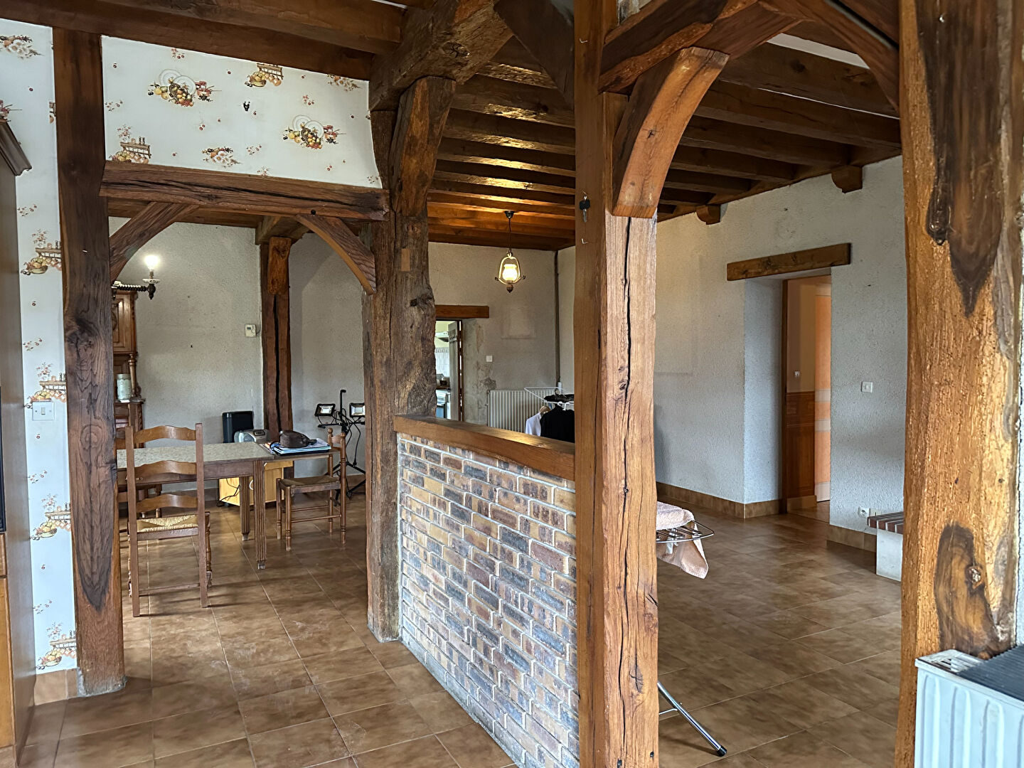 Une longère offrant de plain pied, un grand salon-séjour avec cheminée, une cuisine ouverte, une pièce actuellement utilisée comme cuisine, une chaufferie, 4 chambres, une salle d'eau, une salle de bains, w avec combles au dessus aménageables.