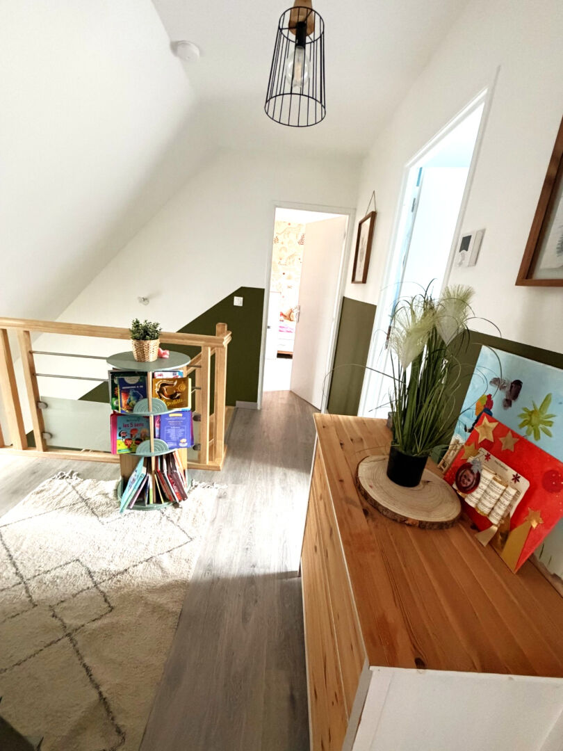 A l'étage : Palier avec mezzanine, 2 chambres, salle de bain.