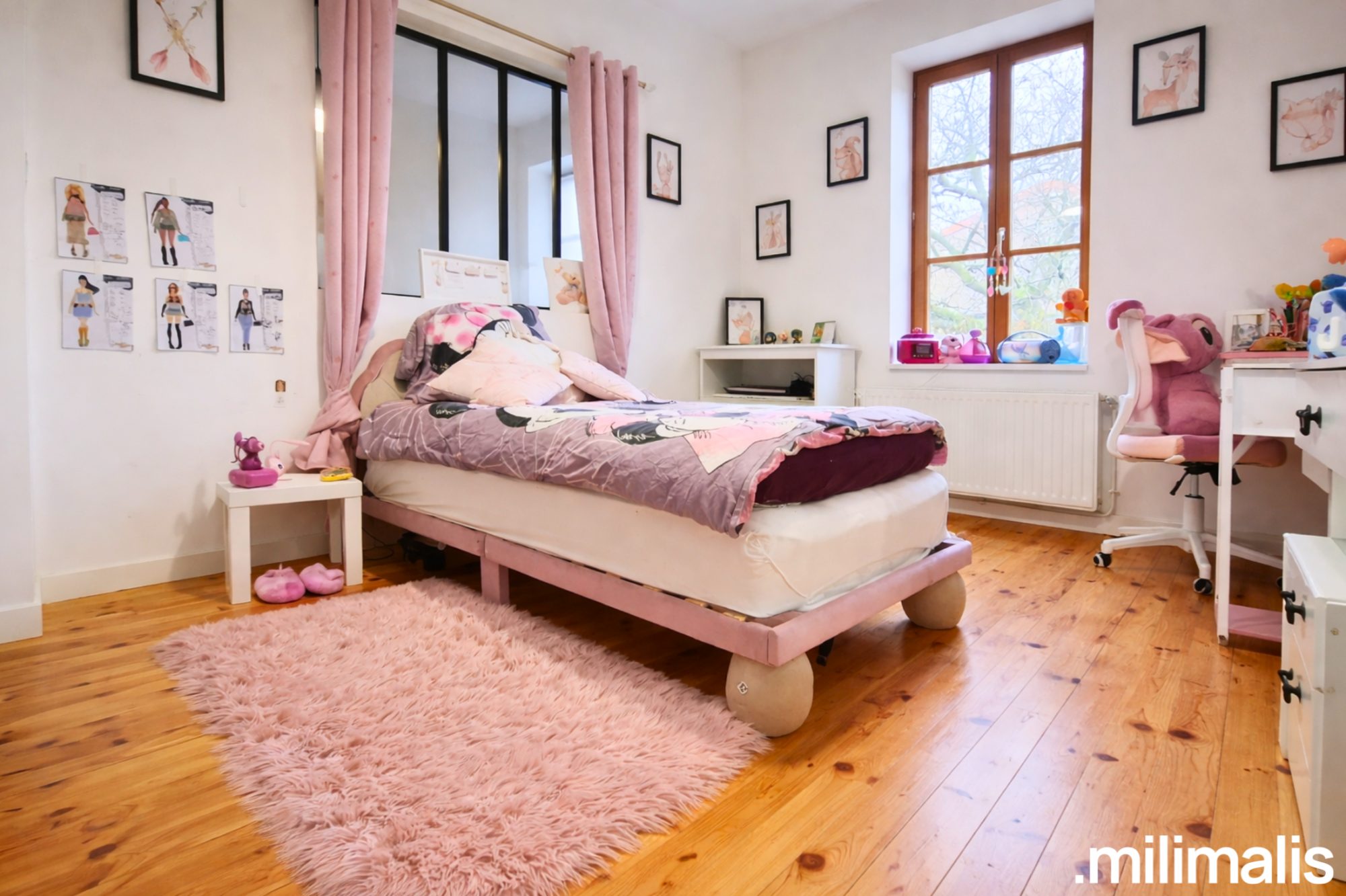 À l'étage, l'espace nuit propose trois grandes chambres et une salle de bain équipée d'une douche et d'une baignoire. Les combles ont été entièrement aménagés et offrent une vaste suite parentale de plus de 70 m² au sol, soit 45 m² habitables, constituant un véritable espace privatif.