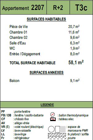 L'appartement offre 58,1 m² habitables, parfaitement agencés :
