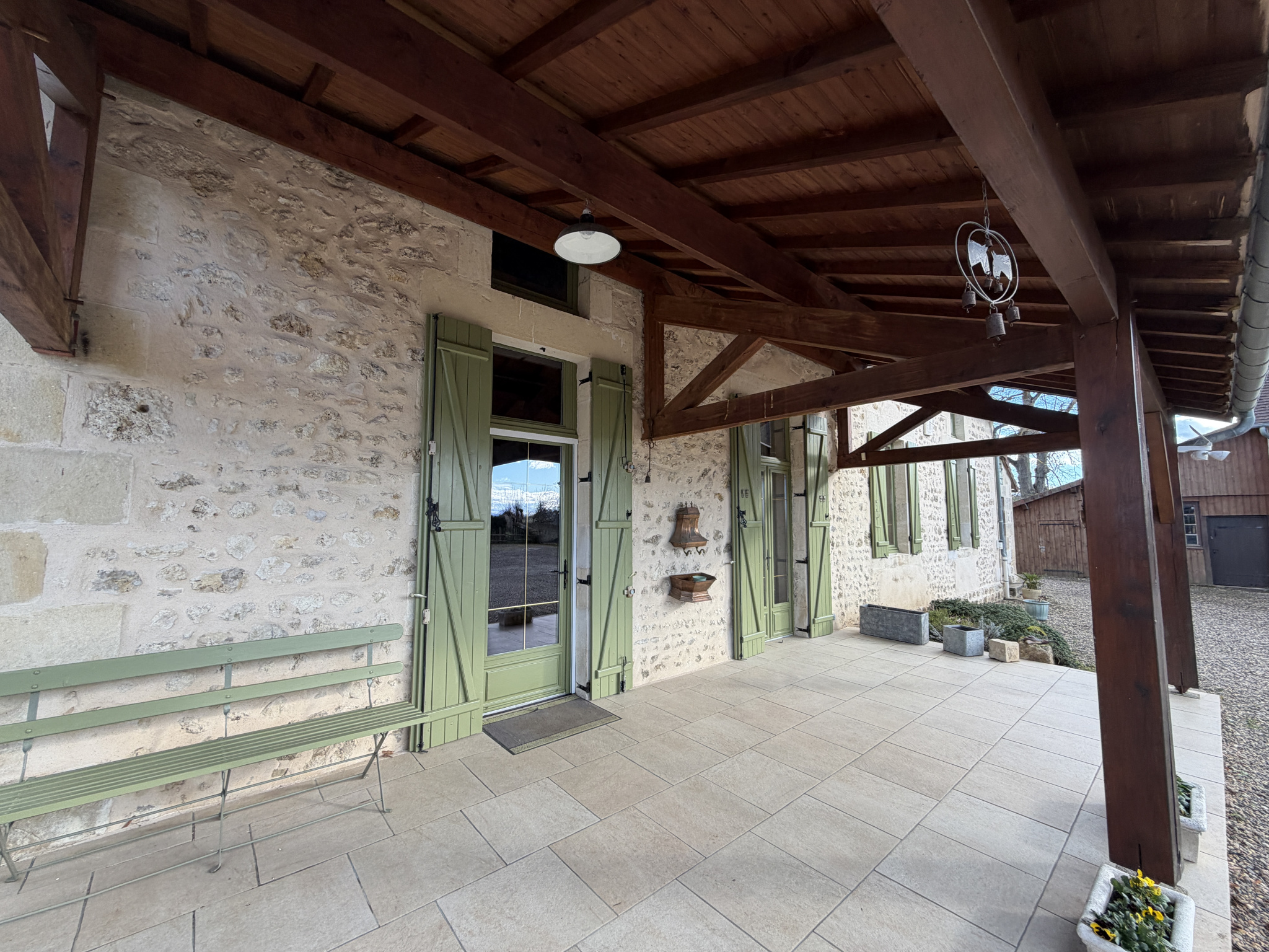 En bon état général, la maison est composée en rez-de chaussée d'une salle à manger-salon de de 35 m2 avec le charme des poutres et des pierres, cuisine équipée, deux chambres, bureau, salle d'eau et WC séparé. Terrasse avant couverte.