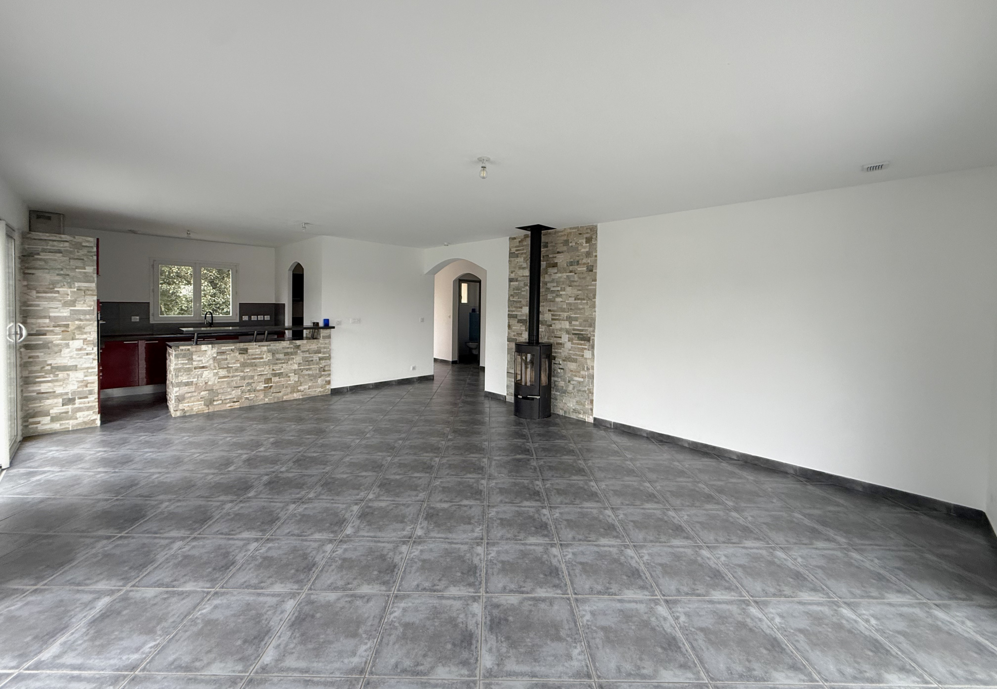 À l'intérieur, on découvre une très belle pièce de vie, spacieuse et baignée de lumière grâce aux grandes baies vitrées qui prolongent naturellement l'espace vers la terrasse et le jardin. Le carrelage grand format et les murs aux tons clairs renforcent la sensation de volume et de modernité. Le poêle à bois design, intégré dans un mur décor pierre, apporte à la fois du caractère et une ambiance chaleureuse. La cuisine ouverte s'intègre parfaitement à cet espace de vie convivial par son style contemporain.