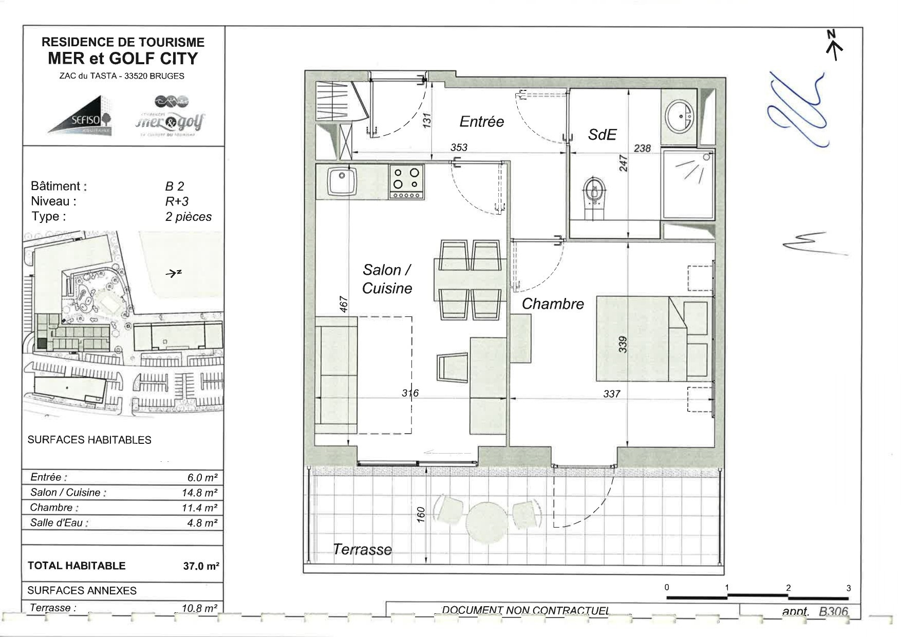 Cet appartement de 36.50m2 se situe 2oétage d'une résidence hôtelière au sein d'un quartier calme et résidentiel, à 800 m du tramway ligne C qui permet, en quelques minutes, de rejoindre le centre historique de Bordeaux.