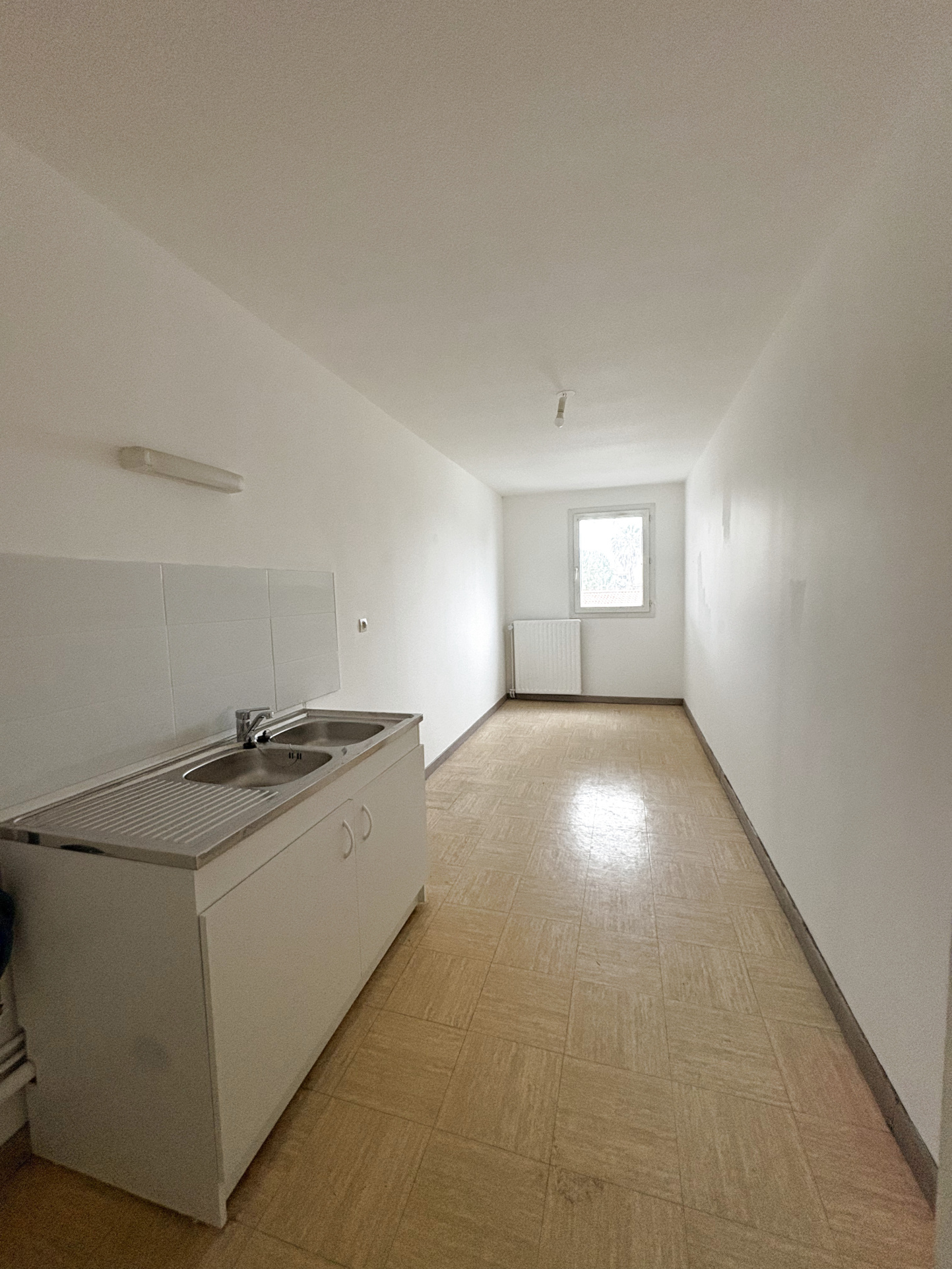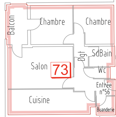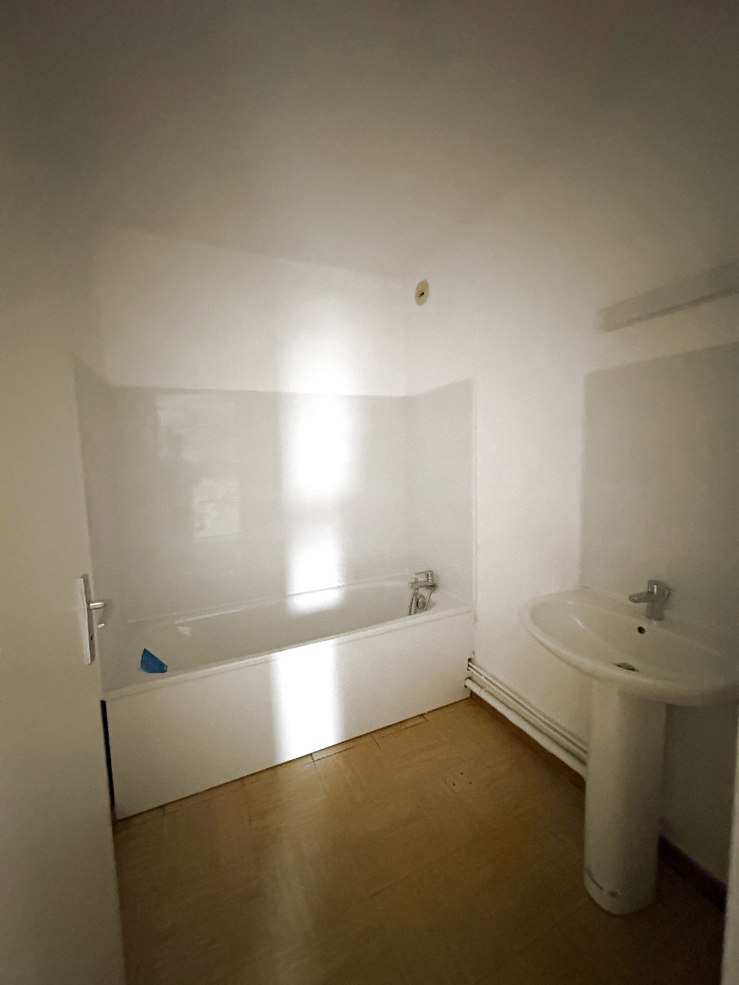 Appartement de type 3 situé au 1er étage et composé d'une entré, une buanderie, un WC, une SdB, une cuisine séparée, deux chambres, un séjour donnant sur une terrasse.