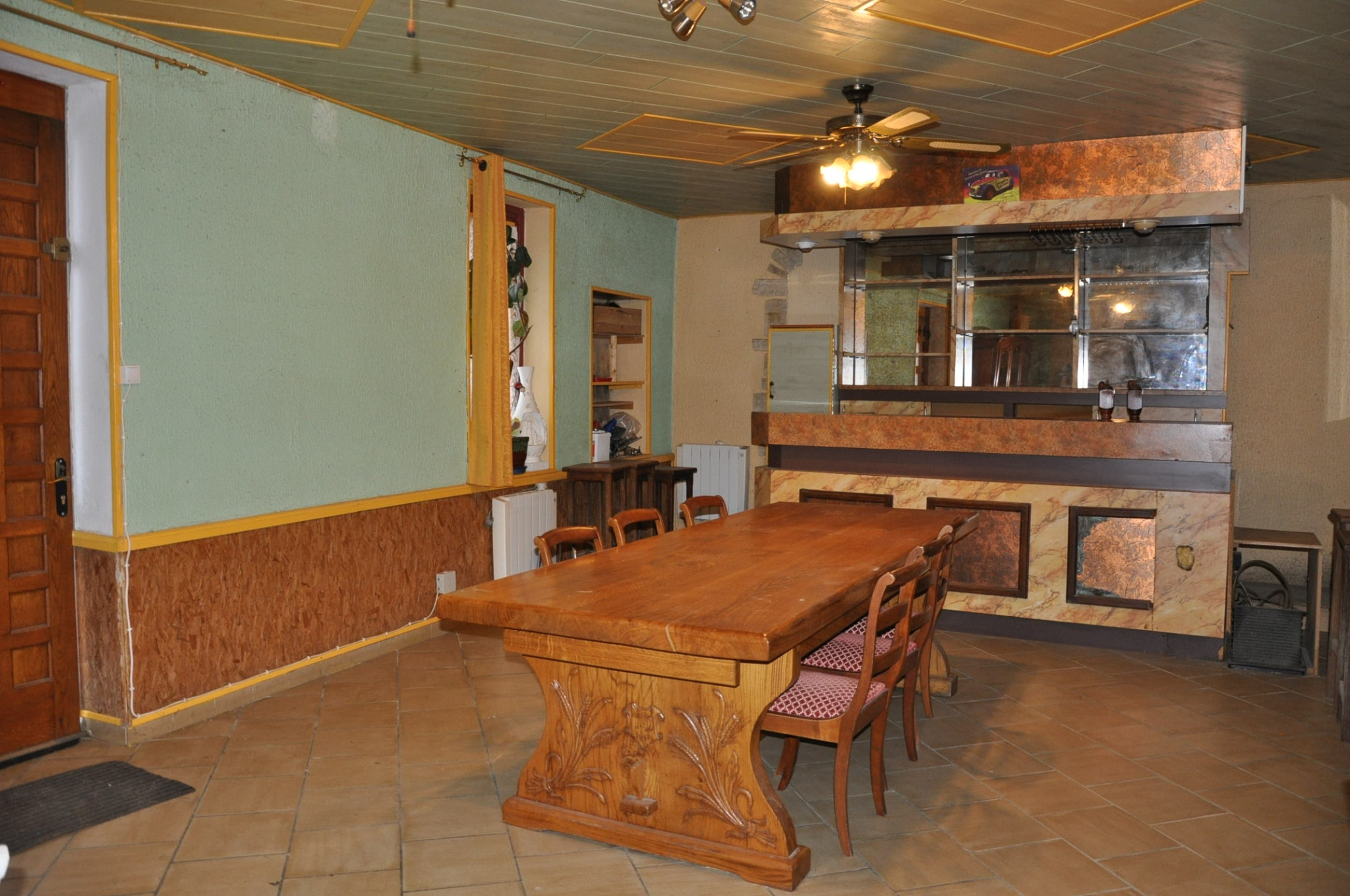 Le premier logement entièrement de plain-pied, élevé sur une cave saine, comprend une grande salle de 44 m2, sur carrelage, avec un bar et un confortable salon-salle à manger, une cuisine séparée de 10 m2, avec un véritable four de boulanger (cf: photo), deux chambres de 12,70 m2 et 14,80 m2 et une salle d'eau avec WC. Chauffage électrique et poêle à bois dans la pièce à vivre.