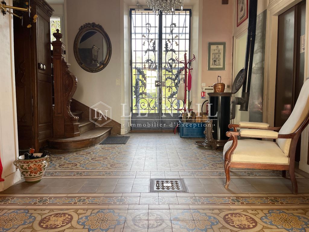 Au-rez-de-chaussée : vous entrez dans un vaste hall où le regard ne sait où se poser, tant les détails sont riches. Le sol, habillé de sublimes carreaux de ciment d'époque, répond en écho à un plafond à la française, dont les poutres aux rayures rouges et blanches apportent une touche d'audace et de caractère unique.