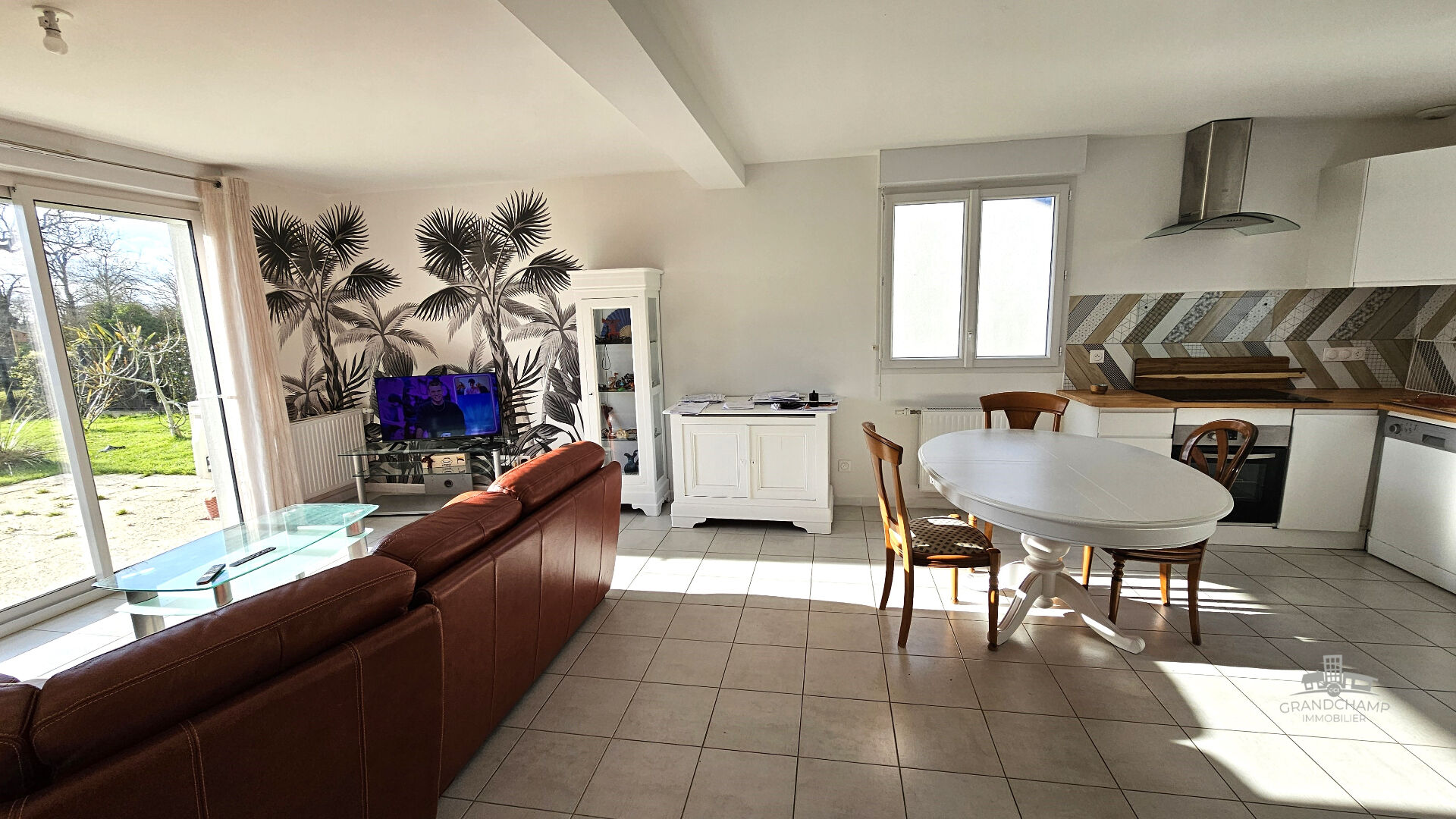 La pièce de vie traversante, parfaitement exposée plein sud, s'ouvre sur une terrasse bénéficiant d'une vue dégagée sur la campagne environnante.