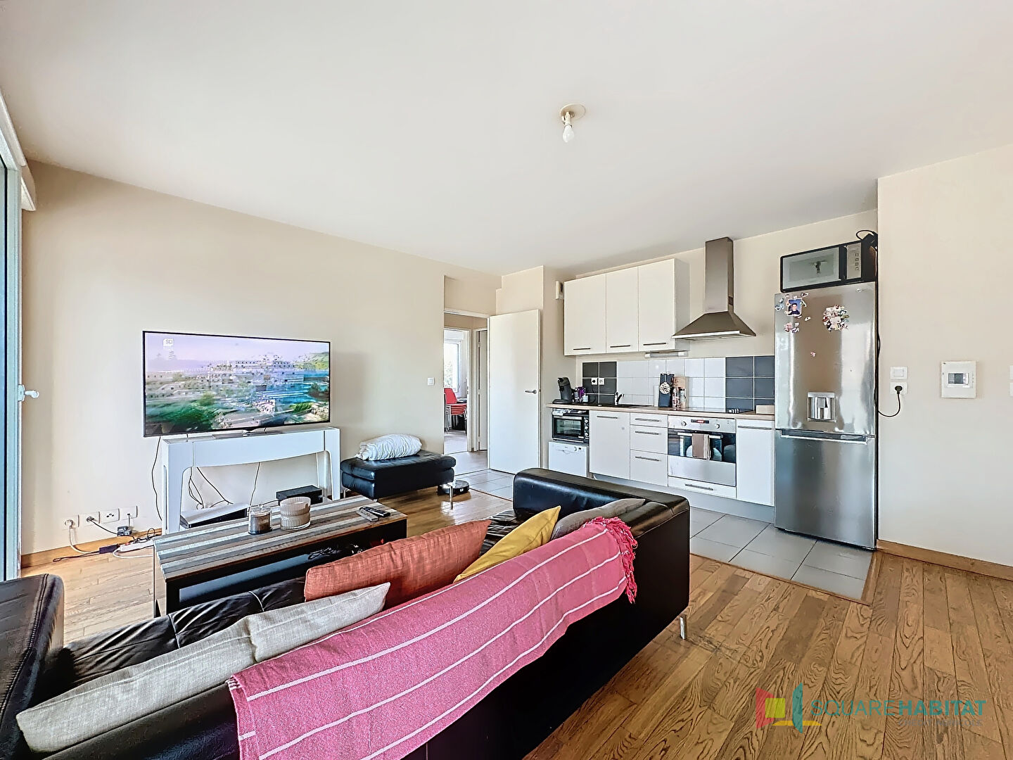 Une grande pièce de vie avec cuisine ouverte aménagée et équipée de + de 25m2, exposée Ouest et ouvrant sur un large balcon de + de 15m2 sans vis-à-vis. 2 chambres dont une de plus de 13 m2, rangement, dégagement, grande salle de bains et W.C. séparés.