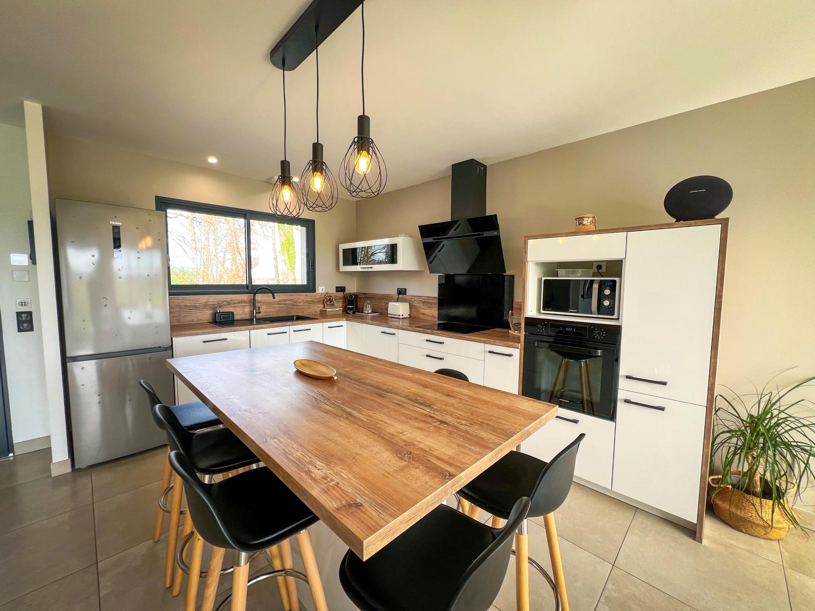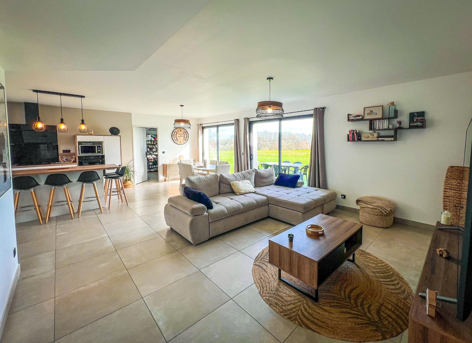 Avec ses 137 m2 de plain-pied, la maison propose un spacieux et lumineux espace de vie d'environ 50 m2, 4 chambres dont une suite parentale, un bureau, une salle de bain, une salle d'eau, ainsi que 2 WC indépendants.