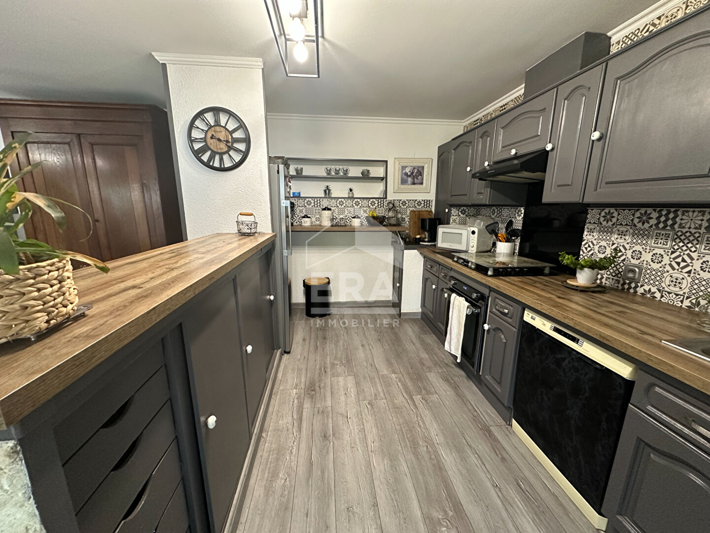A vendre, maison avec belle cuisine dinatoire semi ouverte sur séjour, salon cosy avec cheminée insert, bureau, wc, vestiaire et cellier.