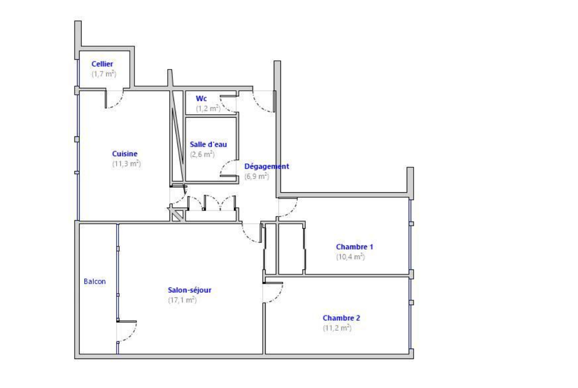 Un appartement de type T3 au troisième étage comprenant : une entrée, deux chambres, un salon séjour donnant sur un balcon, une cuisine, un cellier, une salle d'eau et WC + une cave en sous sol.