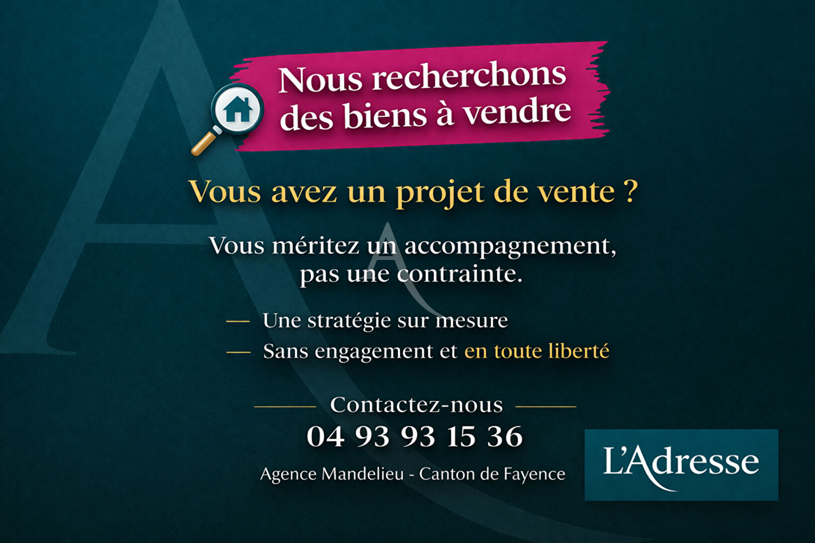 Contactez dès à présent votre agence L'Adresse Mandelieu et Canton de Fayence pour organiser une visite et découvrir tout le confort, la sérénité et le bonheur de vivre que cet appartement a à offrir !