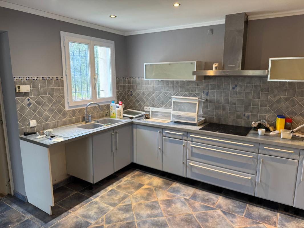 Agencement : Grande pièce de vie séjour / salon / cuisine de plus de 50 m², lumineuse, Cuisine équipée : meubles, hotte, plaques de cuisson, four électrique