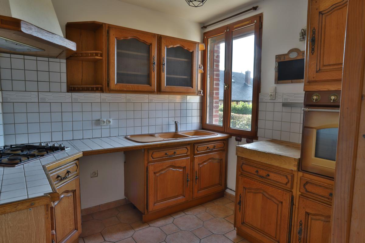 Entre Gisors et Gournay en Bray, maison avec plain pied de vie offrant: entrée, séjour double avec cheminée insert, cuisine aménagée, 1 pièce, 1 chambre, salle d'eau avec double vasque, wc, buanderie dressing. A l 'étage palier desservant 3 chambres dont 2 en enfilades. Abri bois, cabanon de jardin, terrain de 449 m².