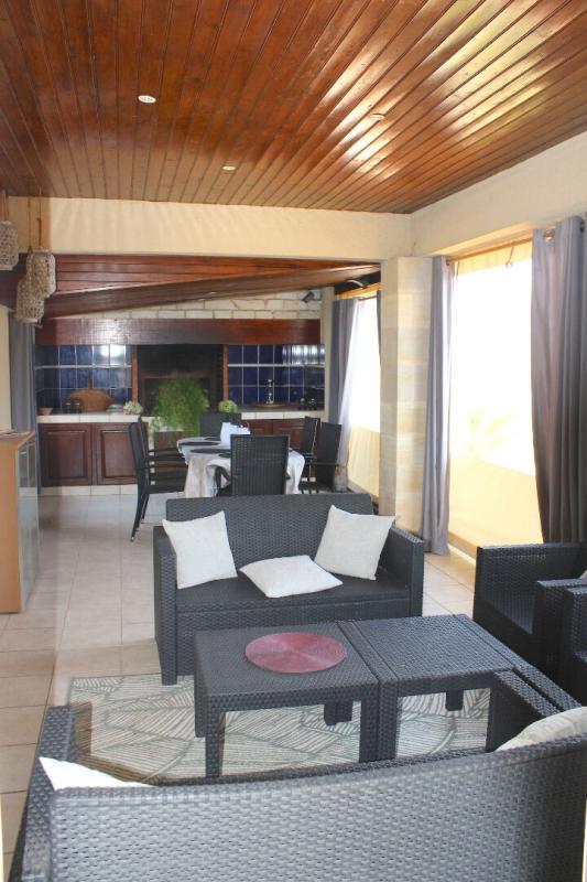 Terrasse couverte et abritée avec salon, salle à manger et cuisine d'été donnant sur la piscine (liner neuf, coque solaire motorisée).