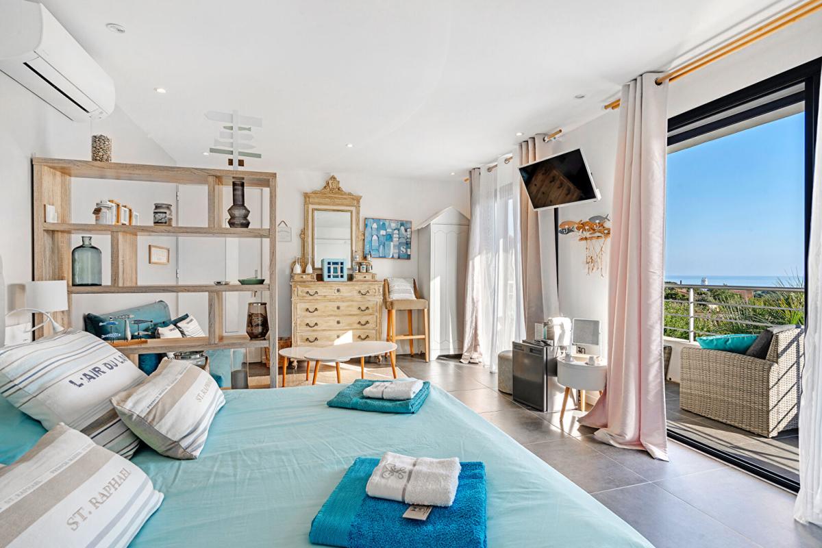 L'étage supérieur est entièrement dédié à une suite parentale avec double dressing, salle d'eau, toilettes et une grande terrasse d'environ 80 m² offrant une vue mer imprenable.