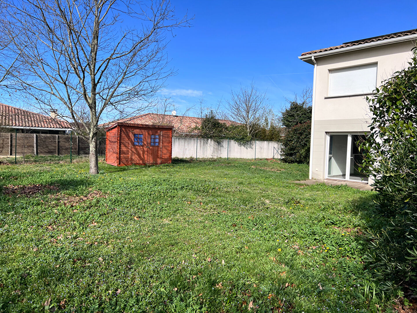d'un seul coté. Elle se compose en bas, d'une entrée , d 'un beau salon séjour lumineux avec sa cuisine ouverte donnant directement sur le jardin de