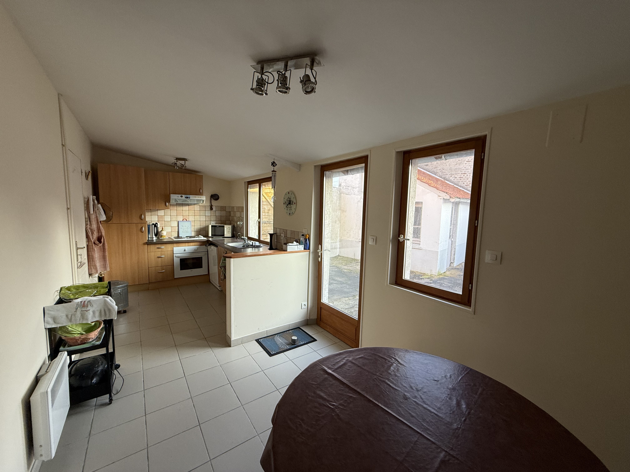 Cette maison pleine de charme se compose d'un séjour avec carrelage ancien, d'une cusine séparée et aménagée donnant sur une grande cour bénificiant d'un deuxième accès et d'une dépendance. Grand garage attenant à la maison.