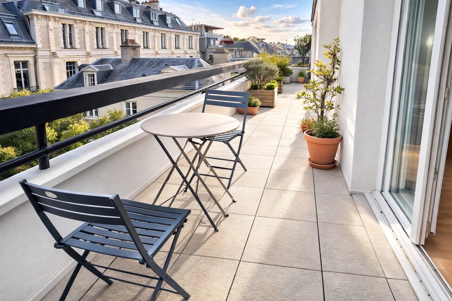 L'appartement est orienté est-sud et ouest avec une terrasse sud sans vis à vis et très au calme