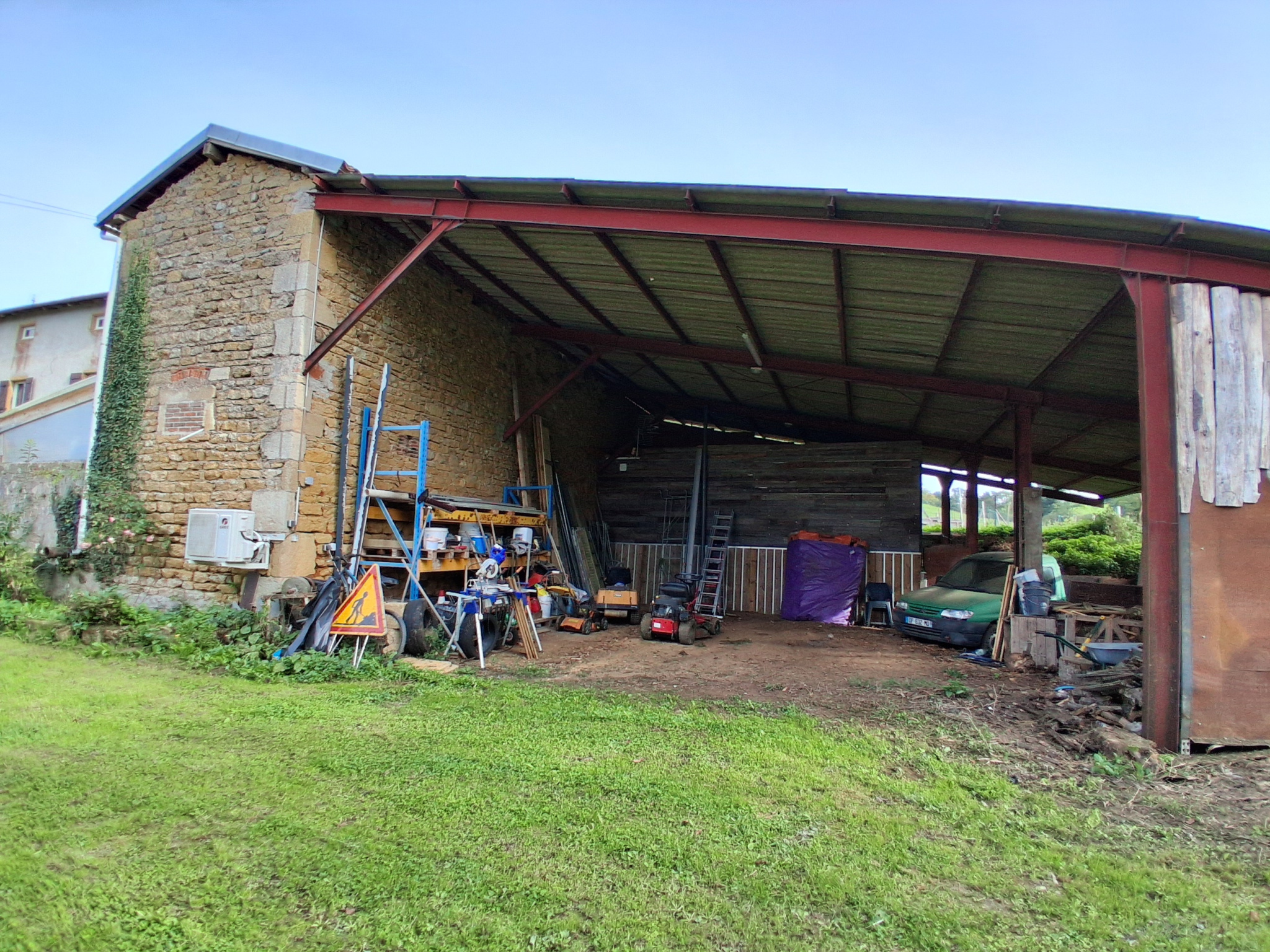 Un grand espace couvert vient compléter cet ensemble. Modulable à souhait, il peut être aménagé selon vos besoins, que ce soit pour un usage professionnel, artisanal ou personnel.
