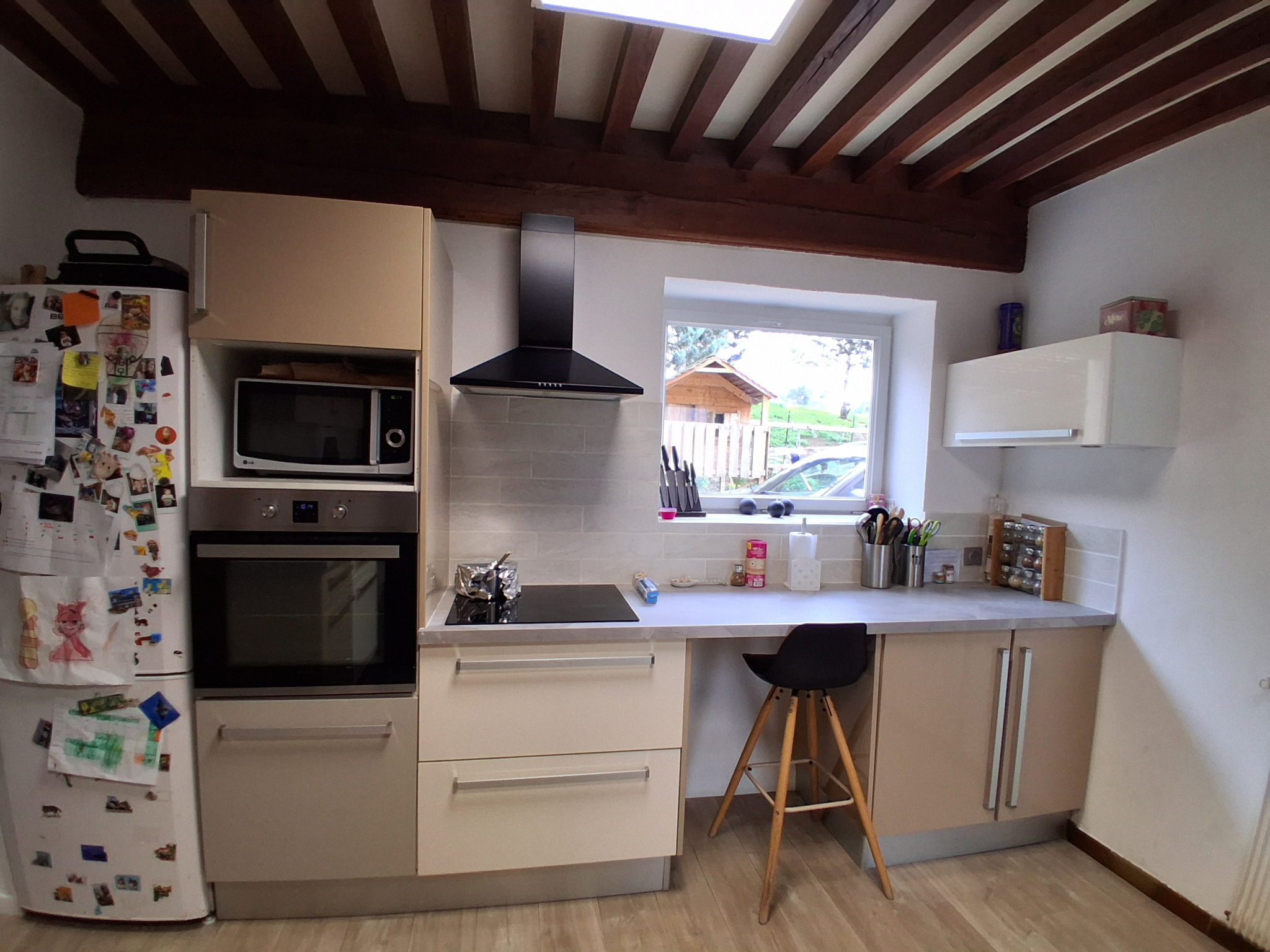 La maison principale offre de très beaux volumes. Au rez-de-chaussée, vous trouverez une cuisine équipée fonctionnelle et chaleureuse, un cellier attenant, un vaste séjour double lumineux, une chambre, un bureau et des toilettes séparées.