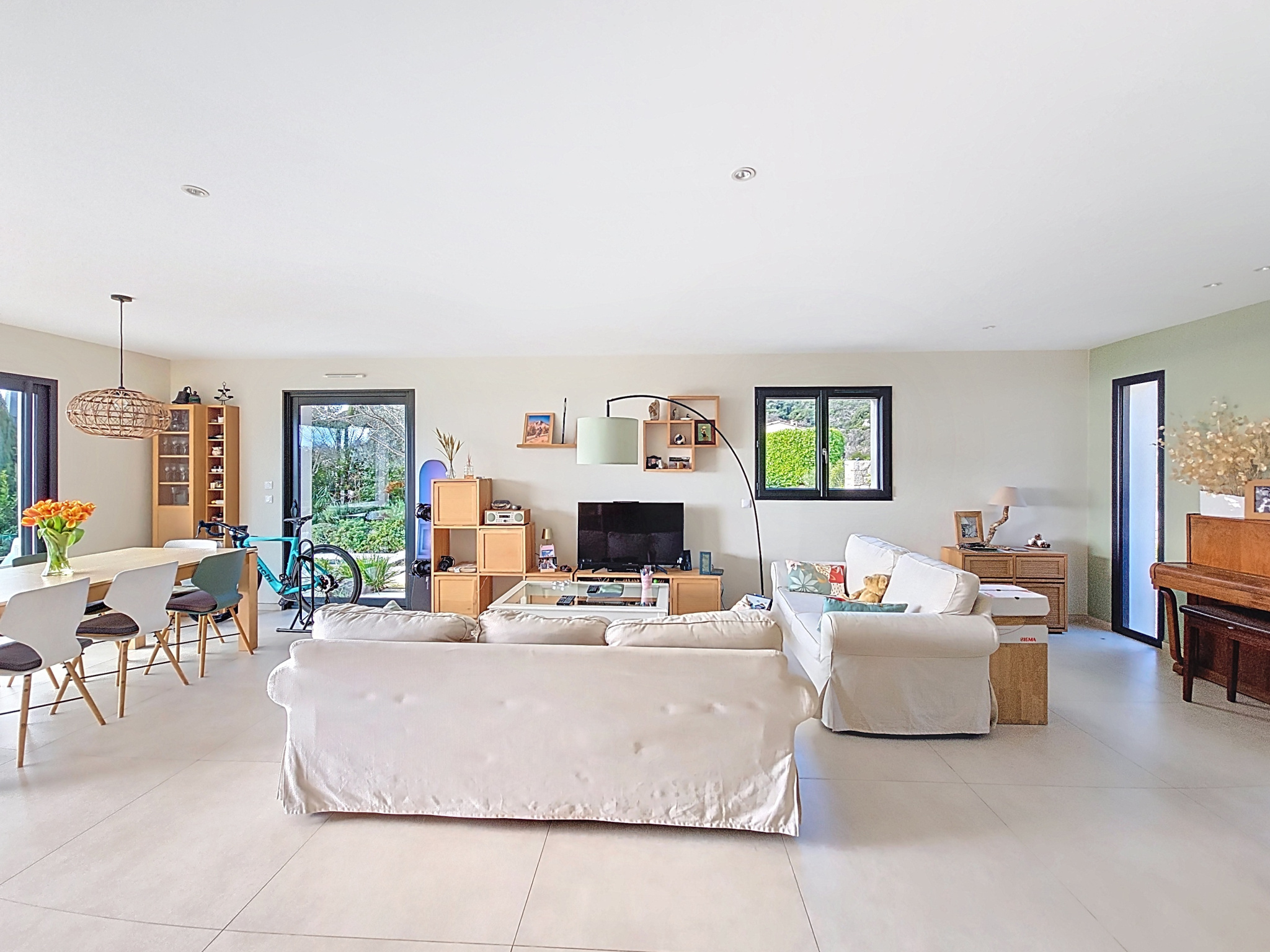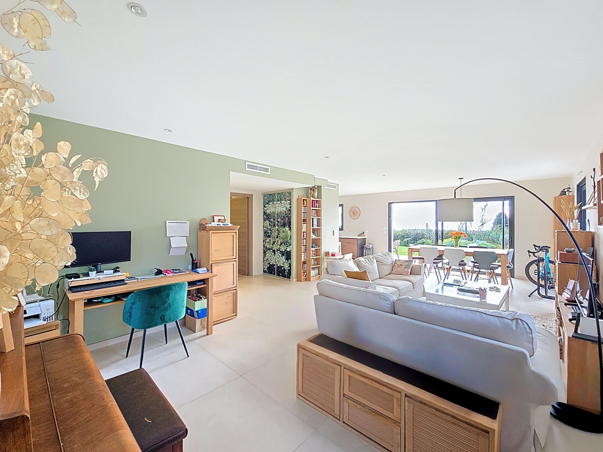 À quelques minutes à pied du village, au calme absolu, découvrez cette villa contemporaine de plain-pied d'environ 140 m2, offrant une vue panoramique exceptionnelle jusqu'à la mer et l'Esterel.