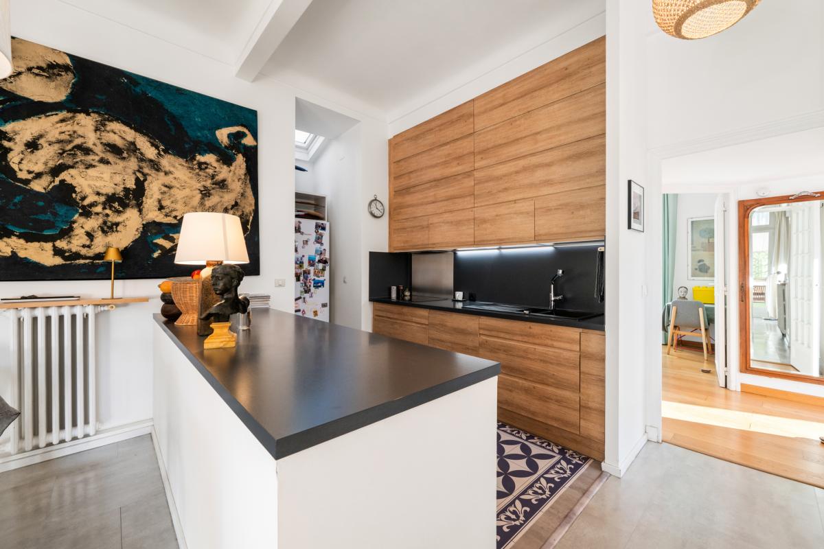 La partie supérieure comprend un séjour lumineux avec cuisine ouverte, trois chambres dont une suite parentale avec salle de bains, une seconde salle de bains ainsi qu'un WC indépendant.