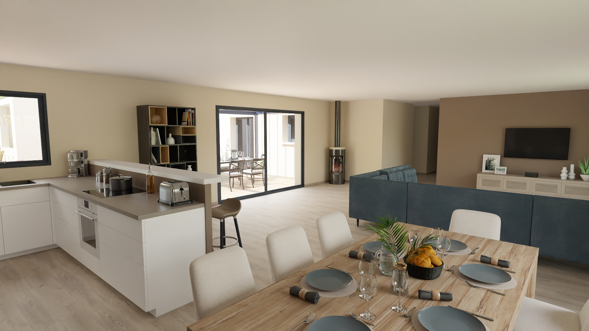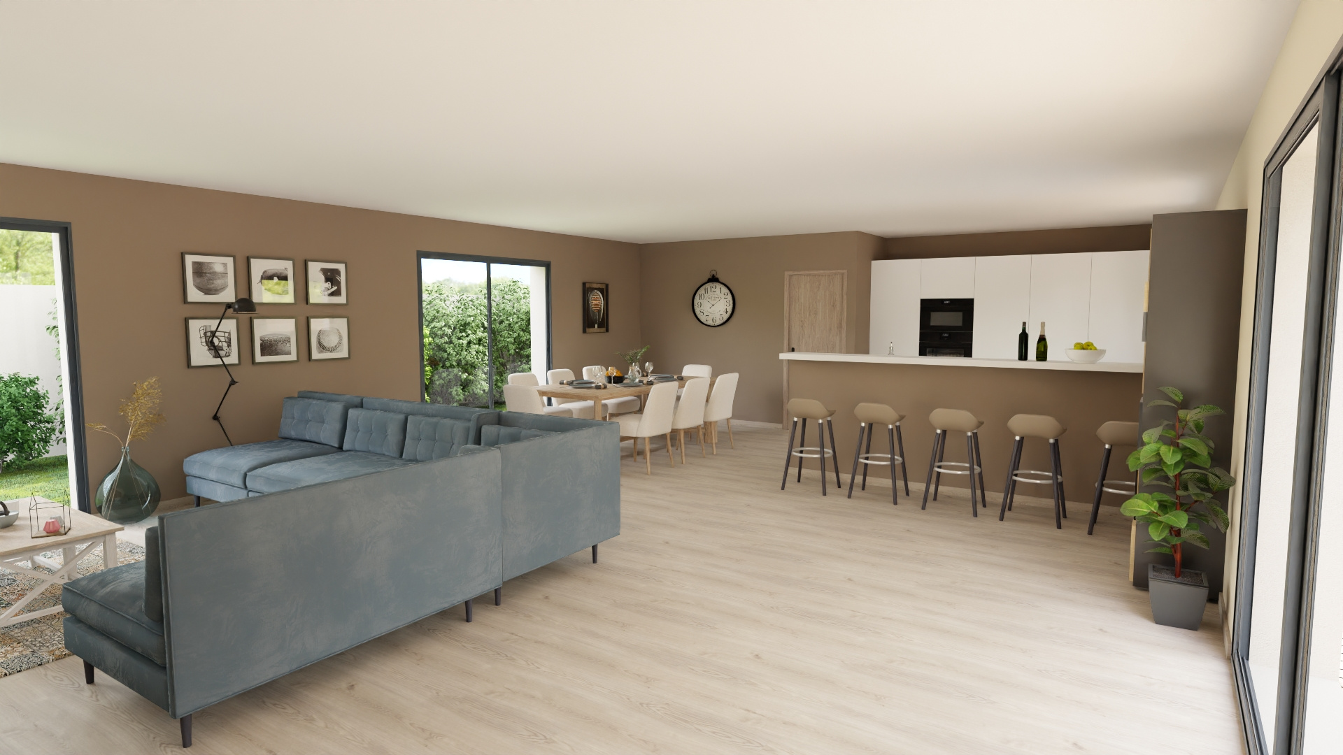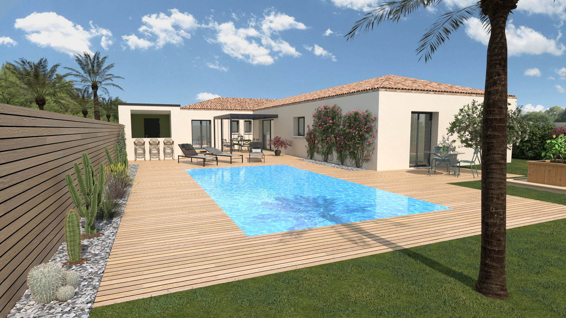Projet complet avec aménagements extérieurs, terrasse, végétaux, cuisine équipée, peintures, placards...