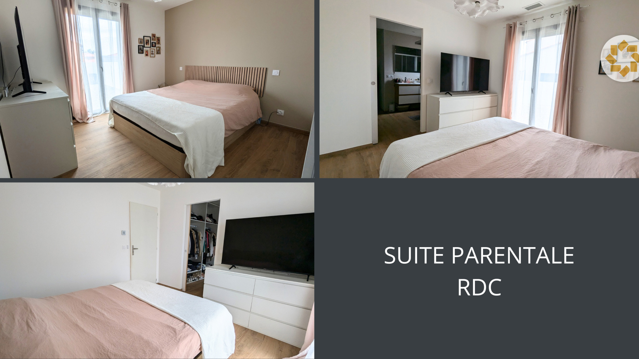 Composée au RDC, d'un grand salon/séjour/cuisine, d'une suite parentale avec dressing et salle d'eau indépendante (meuble deux vasques, douche à l'italienne), d'un WC, d'un cellier avec étagères, d'une buanderie et d'un garage.