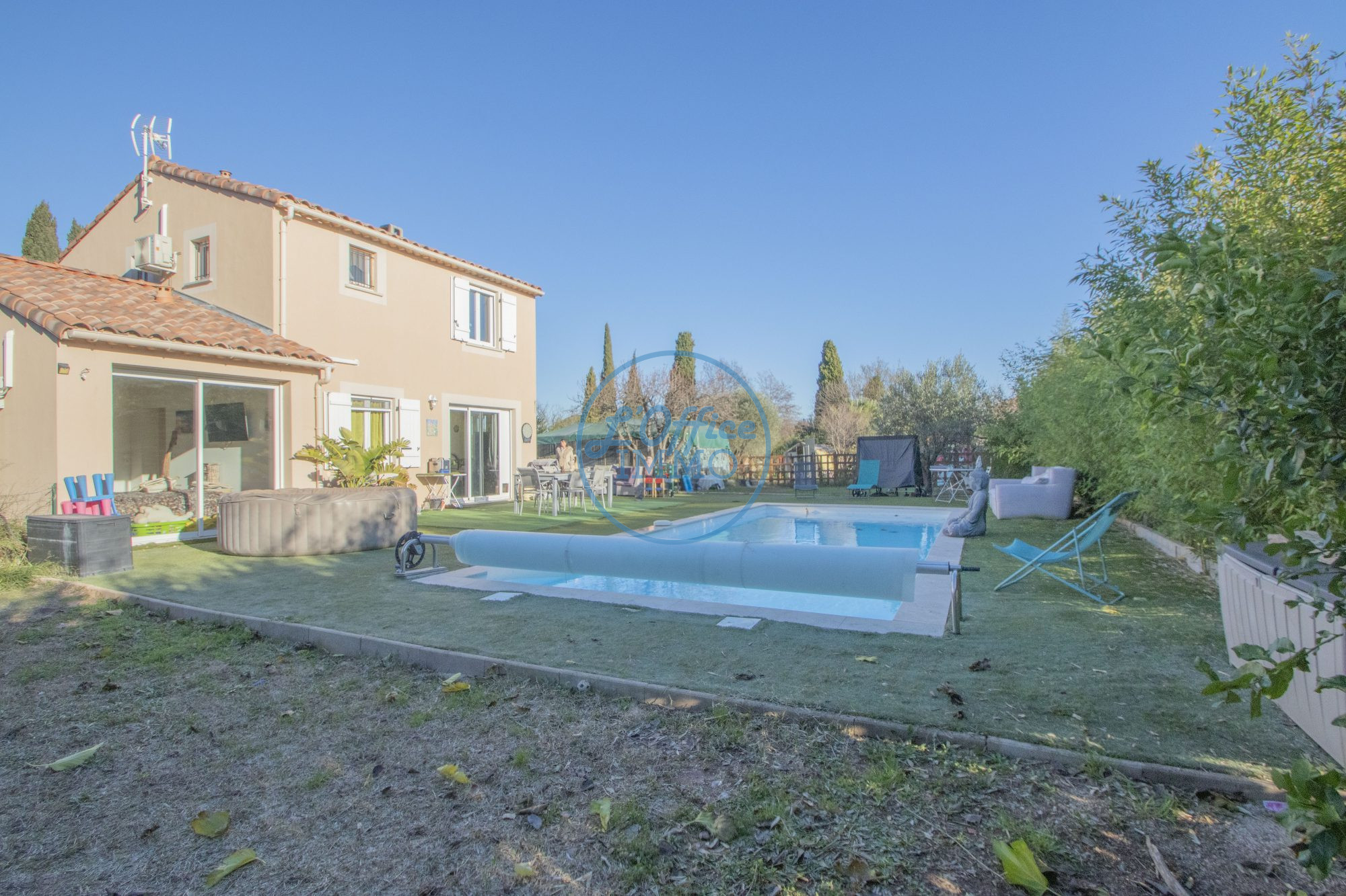 Une piscine au sel de 9 x 3,80 m, réalisée en 2021 et équipée d'un régulateur automatique de pH, complète l'ensemble.