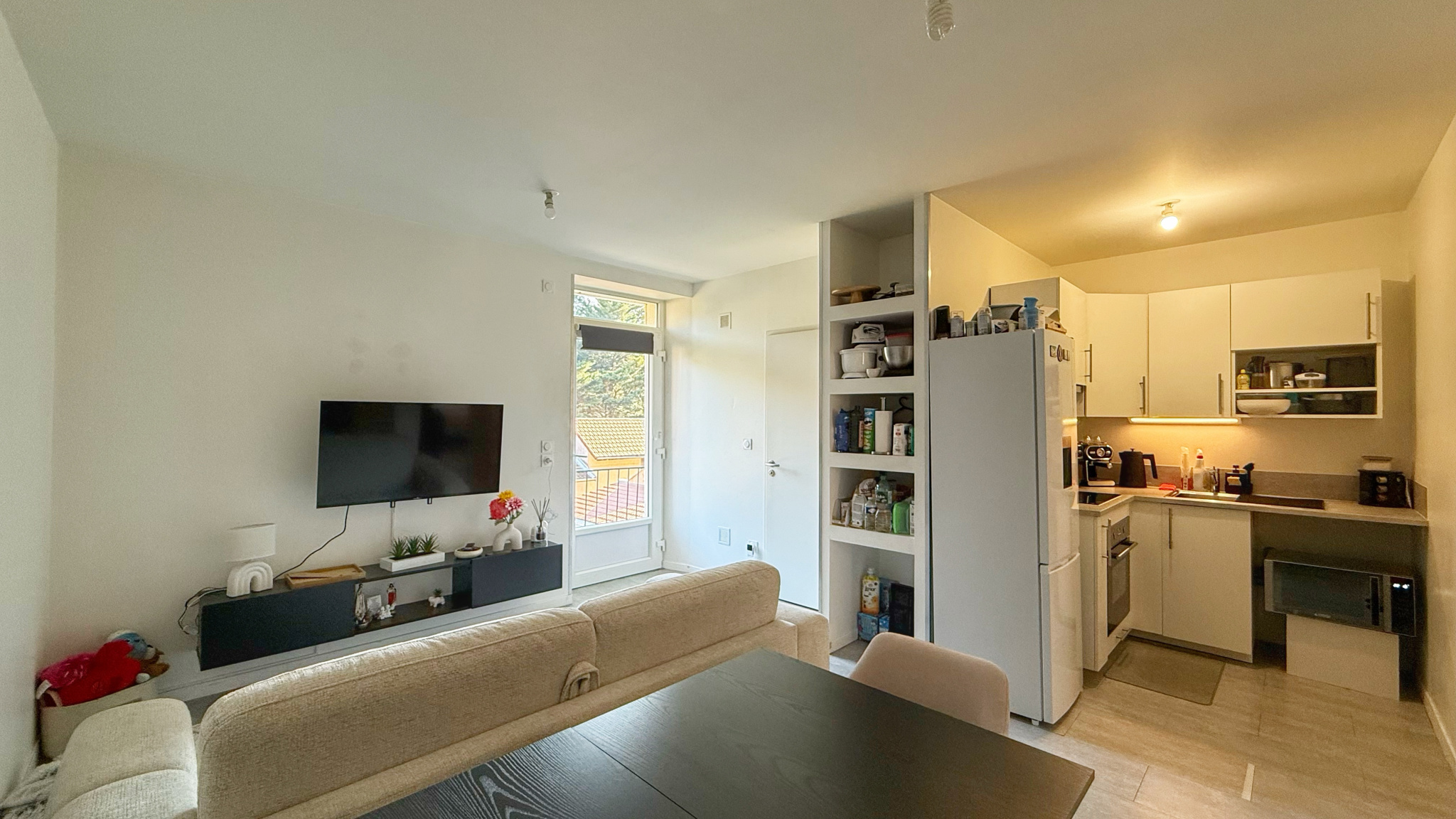 Situé au 1o étage /3, l'appartement se compose d'un séjour avec cuisine ouverte équipée (plaque induction, hotte, four, frégidaire) de 18,50 m2, deux chambres de 9,20 m2 et 9,43 m2 avec placards muraux et d'une salle de bain avec WC de 3,40 m2. Menuiseries PVC double vitrage.