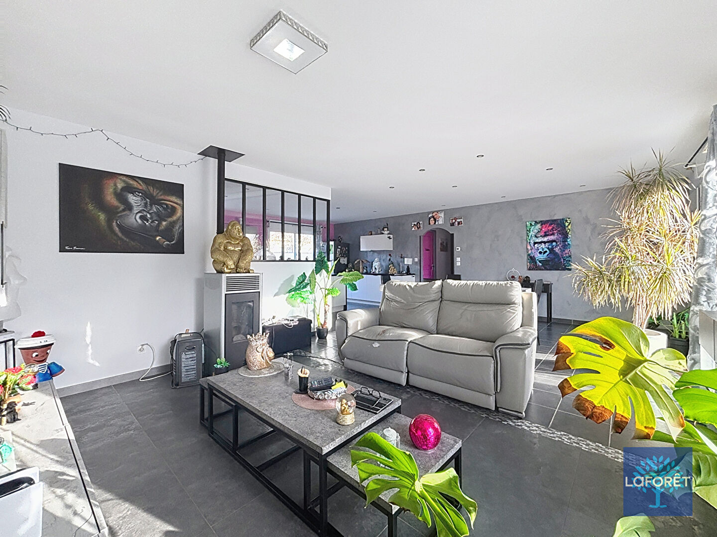 Dès l'entrée, vous y trouverez de beaux volumes donnant sur la pièce de vie traversante exposée Est - Ouest, l'ambiance y est chaleureuse grâce à son poêle à granulés. La cuisine équipée et le cellier complètent cette belle partie vie.