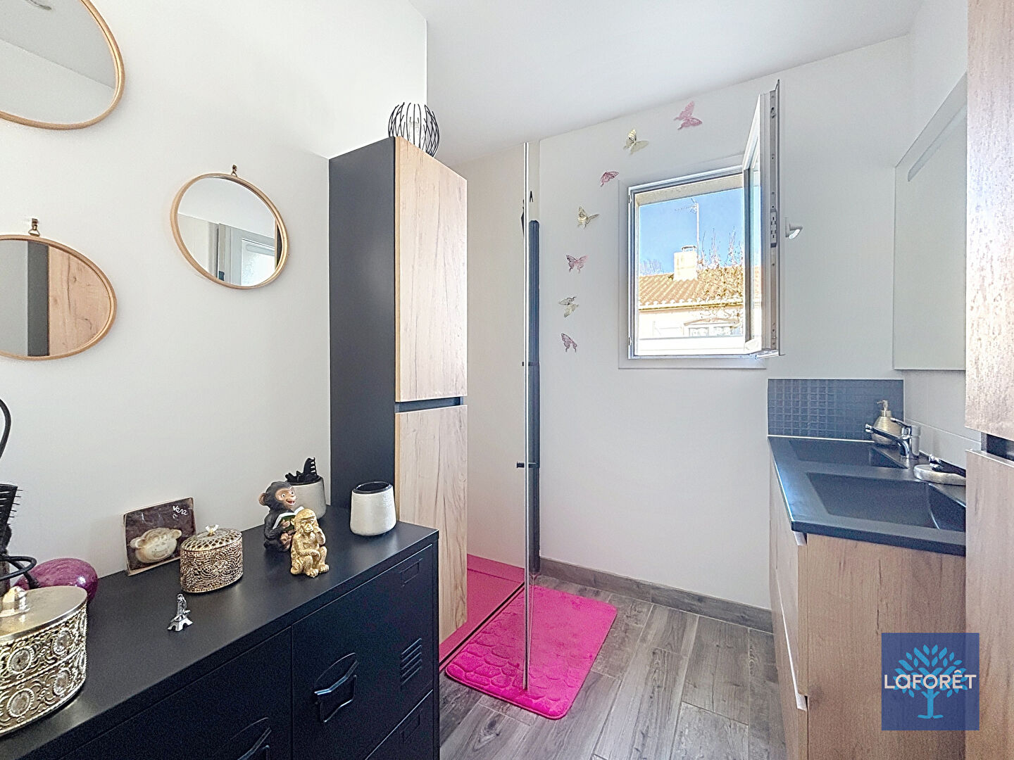 Côté pratique, une arrière cuisine/ buanderie. Pour la voiture, un passage sur le côté avec un carport.