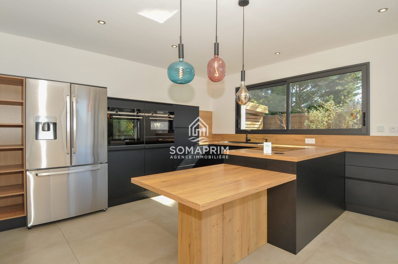 Cuisine américaine ouverte et équipée avec îlot central, espace repas donnant sur la terrasse,