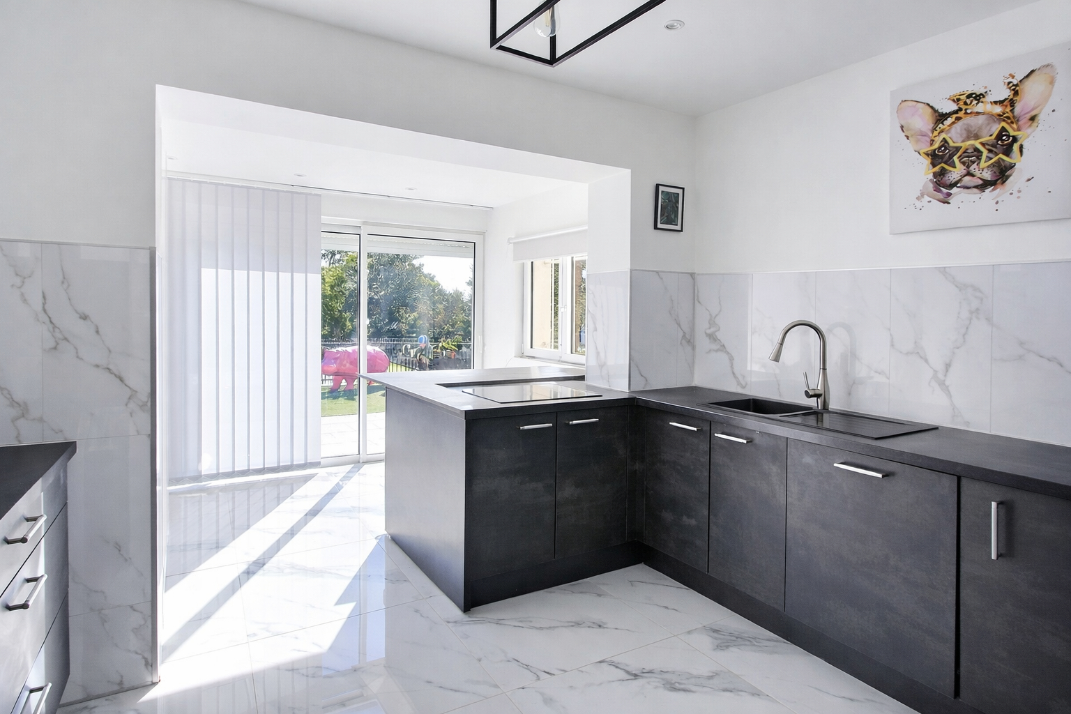 La seconde partie, plutôt destinée à une maison familiale de type T4, a été entièrement rénovée dans un style moderne et épuré, aux tonalités minérales béton, offrant une ambiance élégante et contemporaine. L'intérieur, en parfait état, propose un beau séjour lumineux avec mezzanine utilisée en chambre, un espace repas convivial et une cuisine dinatoire ouverte sur l'extérieur, donnant directement sur la terrasse et l'espace piscine. L'espace nuit se compose d'une suite parentale, d'une seconde salle d'eau ainsi que d'une chambre supplémentaire.