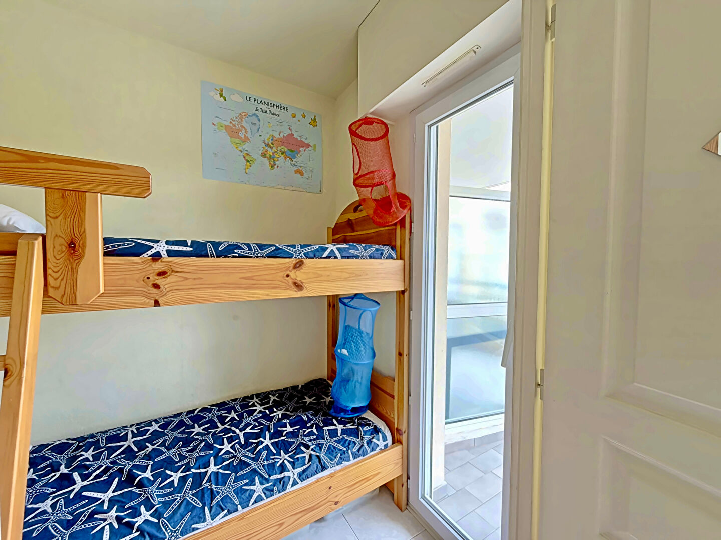Une entrée,une pièce à vivre lumineuse avec coin cuisine et placard,un espace nuit avec lits superposés.une salle de bain,un WC.