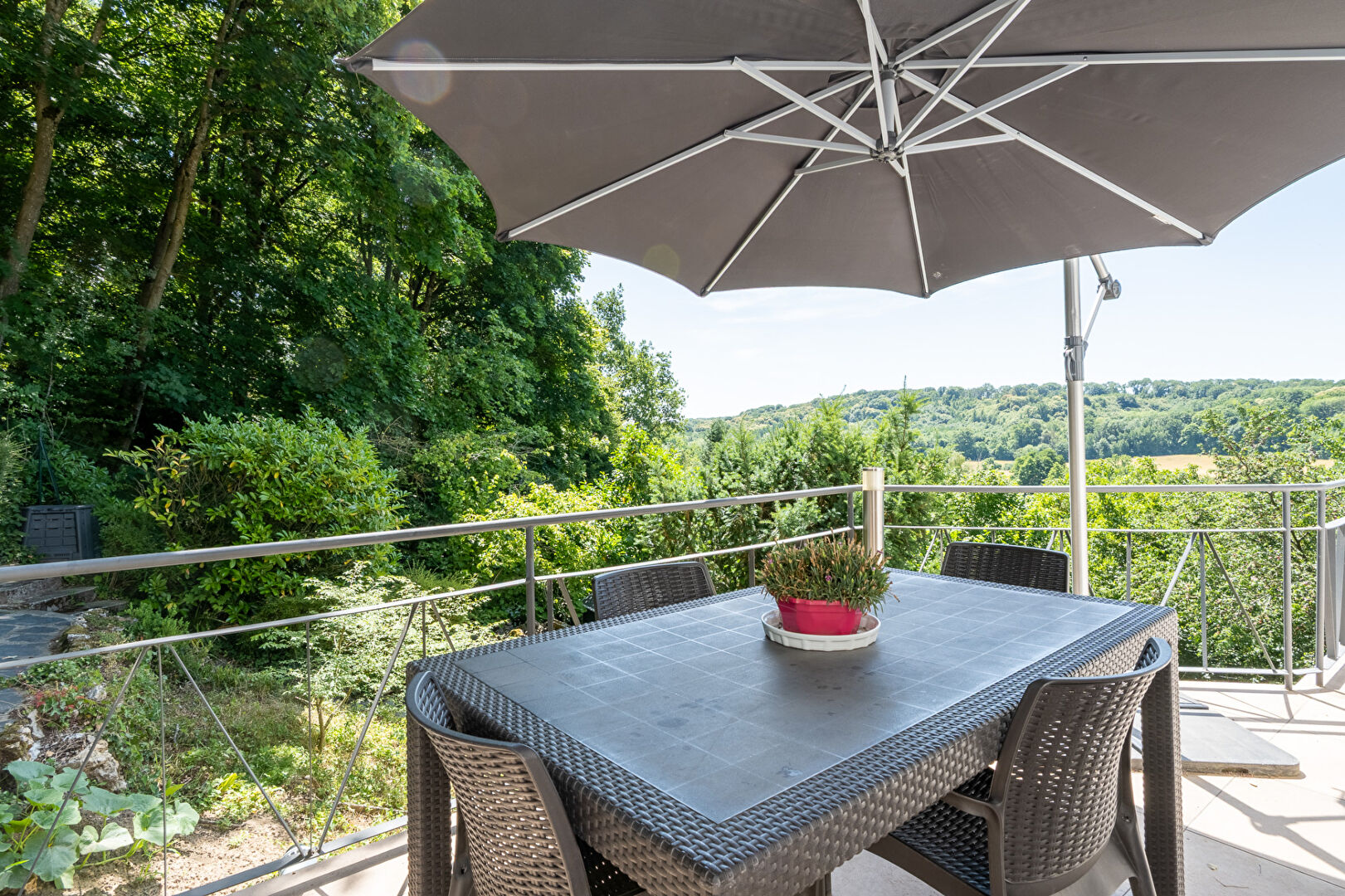 Dans un environnement verdoyant, et avec une vue imprenable sur la vallée, cette maison lumineuse offre un séjour chaleureux avec insert et grandes baies vitrées ouvrant sur un balcon panoramique. La cuisine équipée donne accès à une agréable terrasse.
