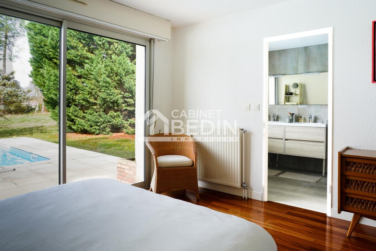 Maison Golf de Pessac. Découvrez cette villa d?exception plongée dans un écrin de verdure de 120 hectares de pinèdes, plans d?eau et bosquets du prestigieux golf de Pessac. Cette maison d?architecte de 203 m² allie élégance contemporaine et cadre de vie apaisant.
