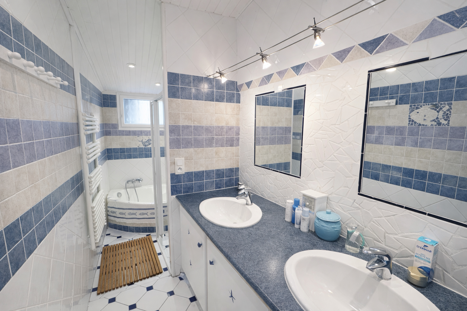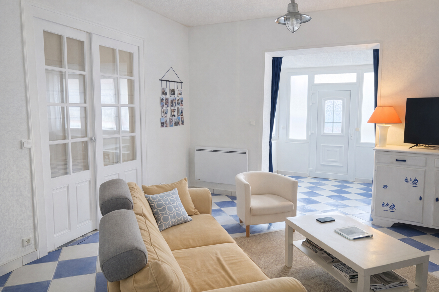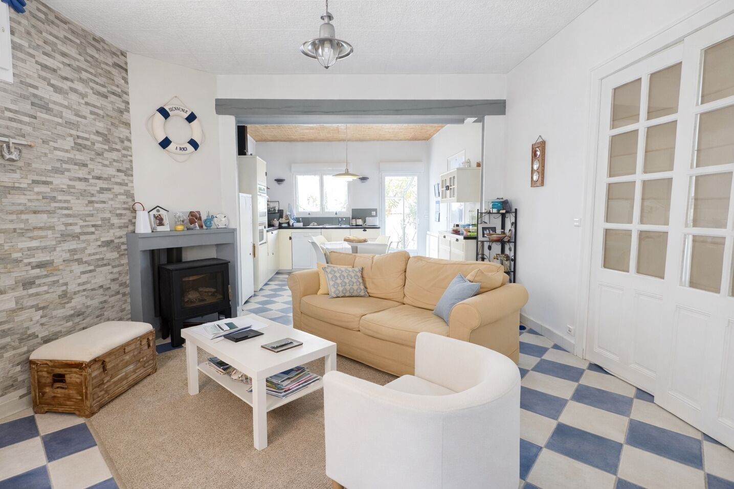 Elle se compose d'une entrée lumineuse, d'une pièce de vie chaleureuse avec poêle à bois, d'une cuisine ouverte aménagée et équipée, de deux belles chambres, d'une salle de bains avec douche, d'un WC indépendant et d'un cellier.