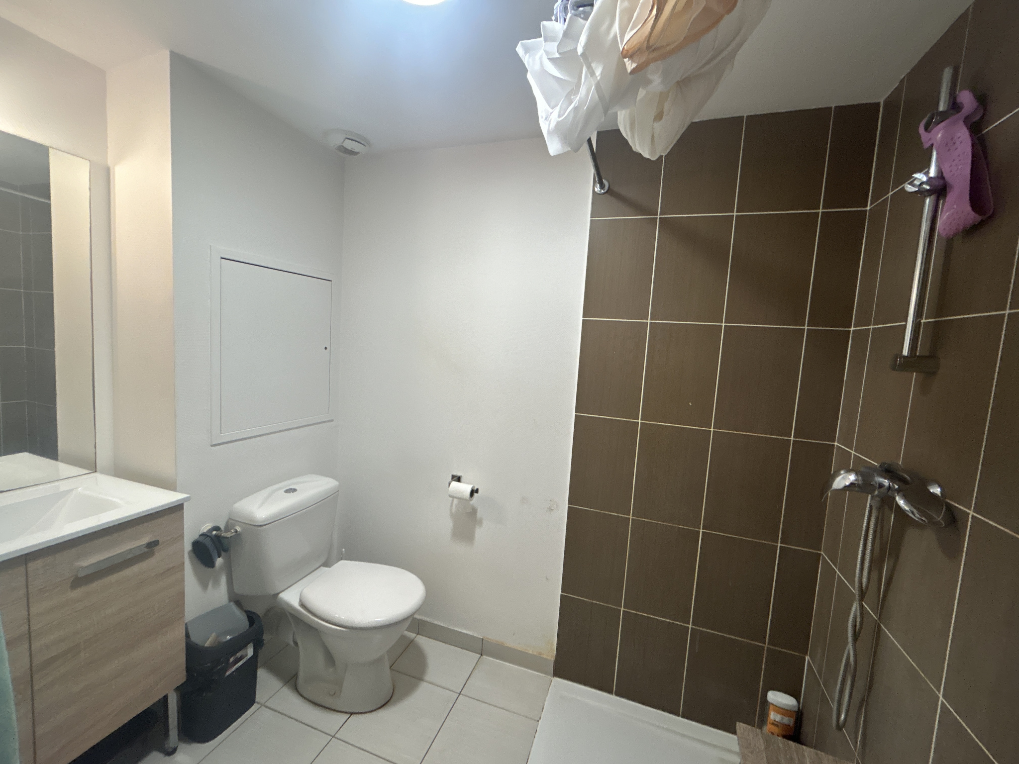 Le Logement est entièrement meublé et équipé : pièce de vie avec lit double, bureau, placards et espace cuisine équipée, salle d'eau privée avec WC et douche.