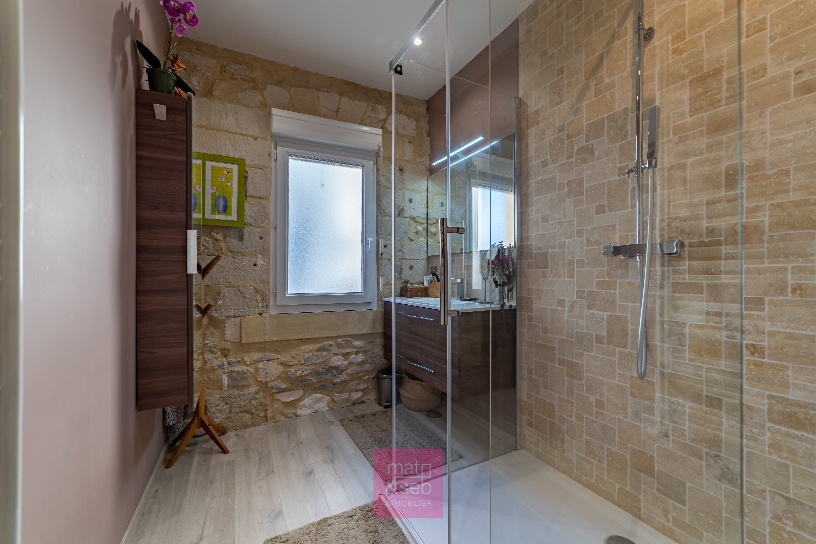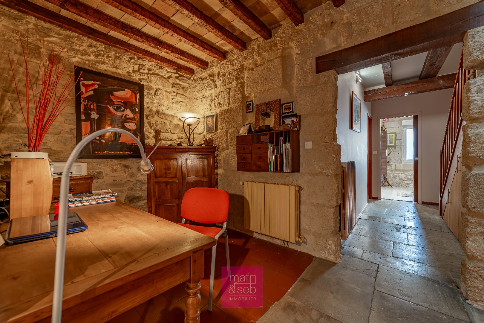 Pierres apparentes, vaste séjour baigné de lumière, baie panoramique ouverte sur un jardin intime?