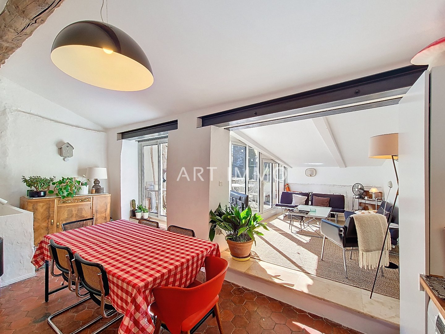 Enfin au dernier étage se trouvent la pièce de vie lumineuse, articulée autour de la terrasse avec une magnifique vue sur le clocher de l'église.
