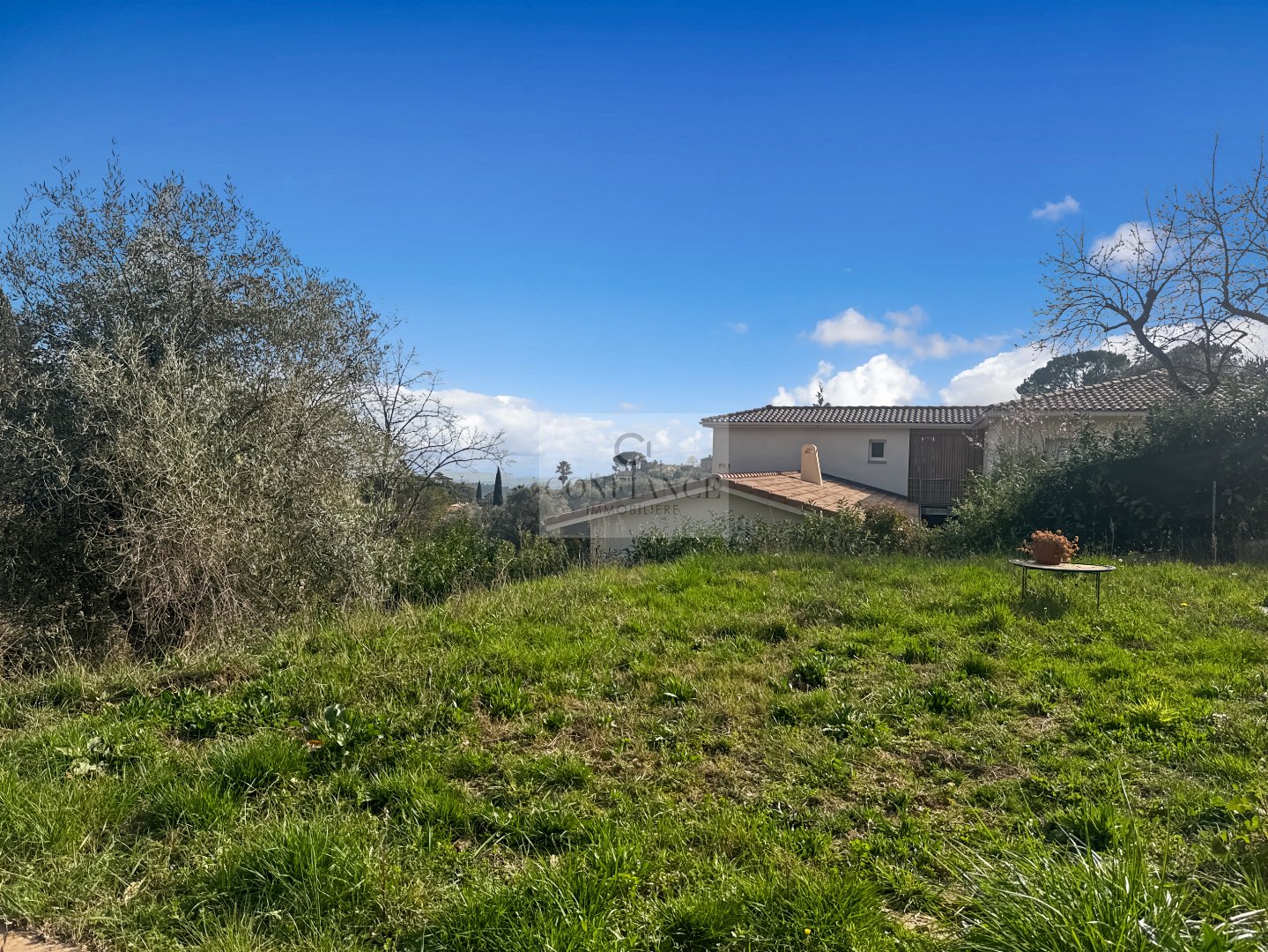 Beau terrain d'environ 950 m2 joliment arboré de mimosa et d'oliviers et offrant une partie plane.