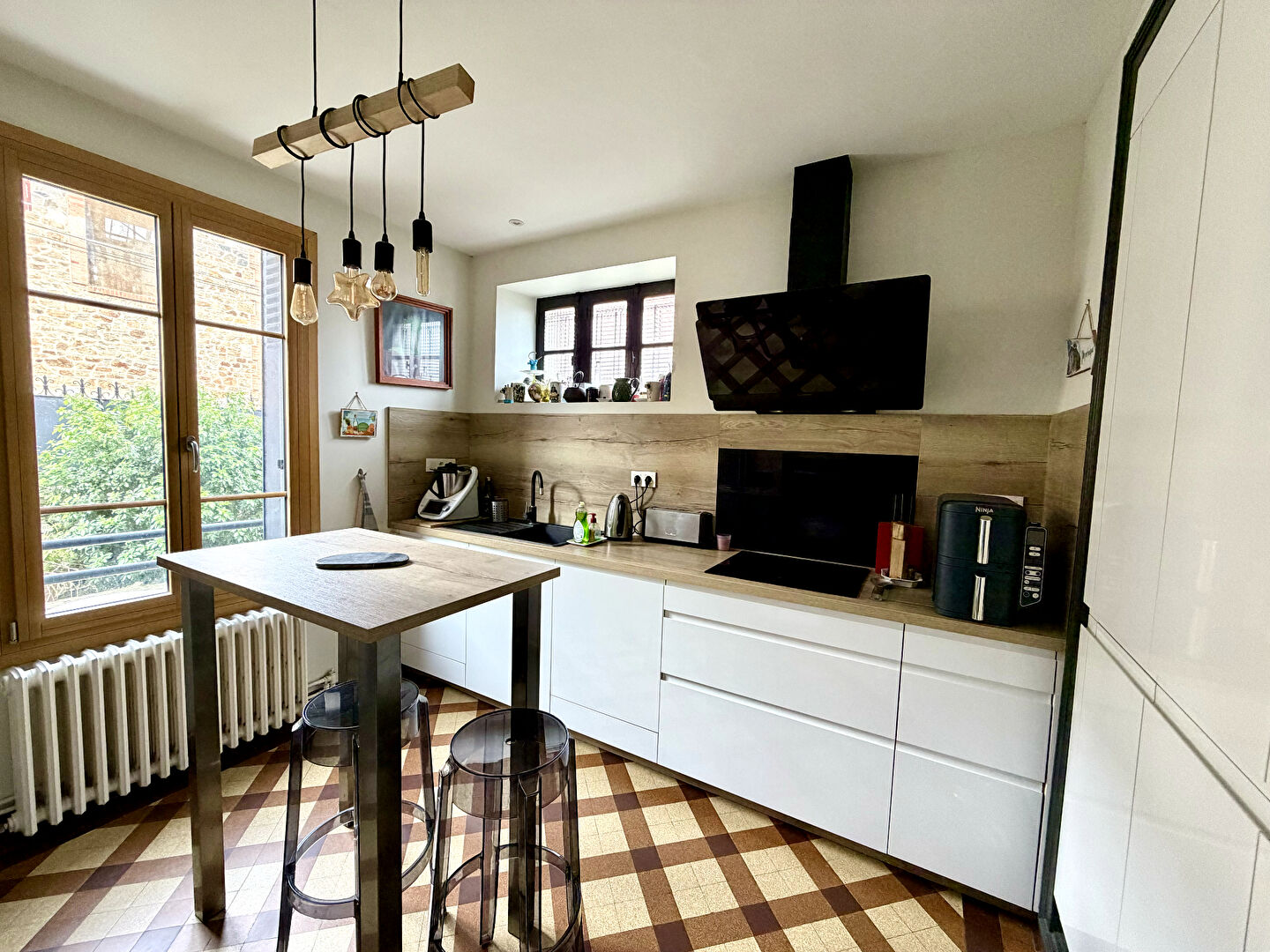 Une belle entrée, un agréable séjour double avec poele à bois donnant sur jardin, cuisine aménagée et équipée avec soin, un WC