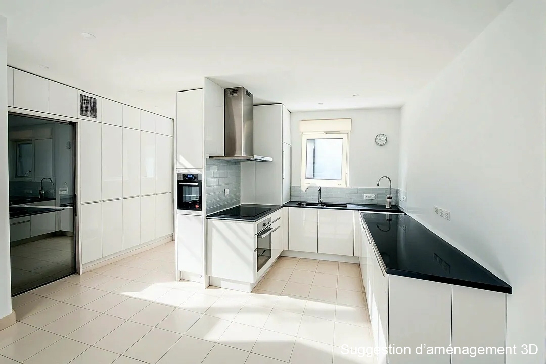 La pièce de vie lumineuse avec cuisine ouverte s'ouvre sur une grande terrasse de 12 m² avec une vue agréable sur la nature environnante.