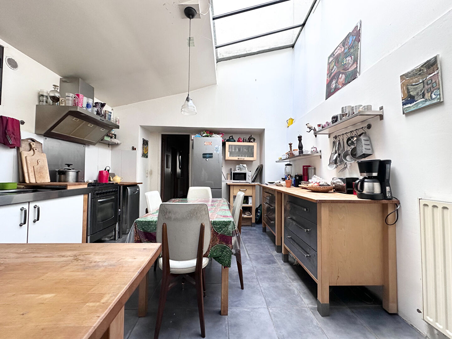 Le vaste séjour permet d'imaginer différents espaces de vie : salon cosy, salle à manger conviviale, coin lecture ou espace de travail. La mezzanine surplombe élégamment la pièce principale et ajoute caractère et fonctionnalité, idéale pour un bureau, un atelier d'artiste ou des chambres supplémentaires.