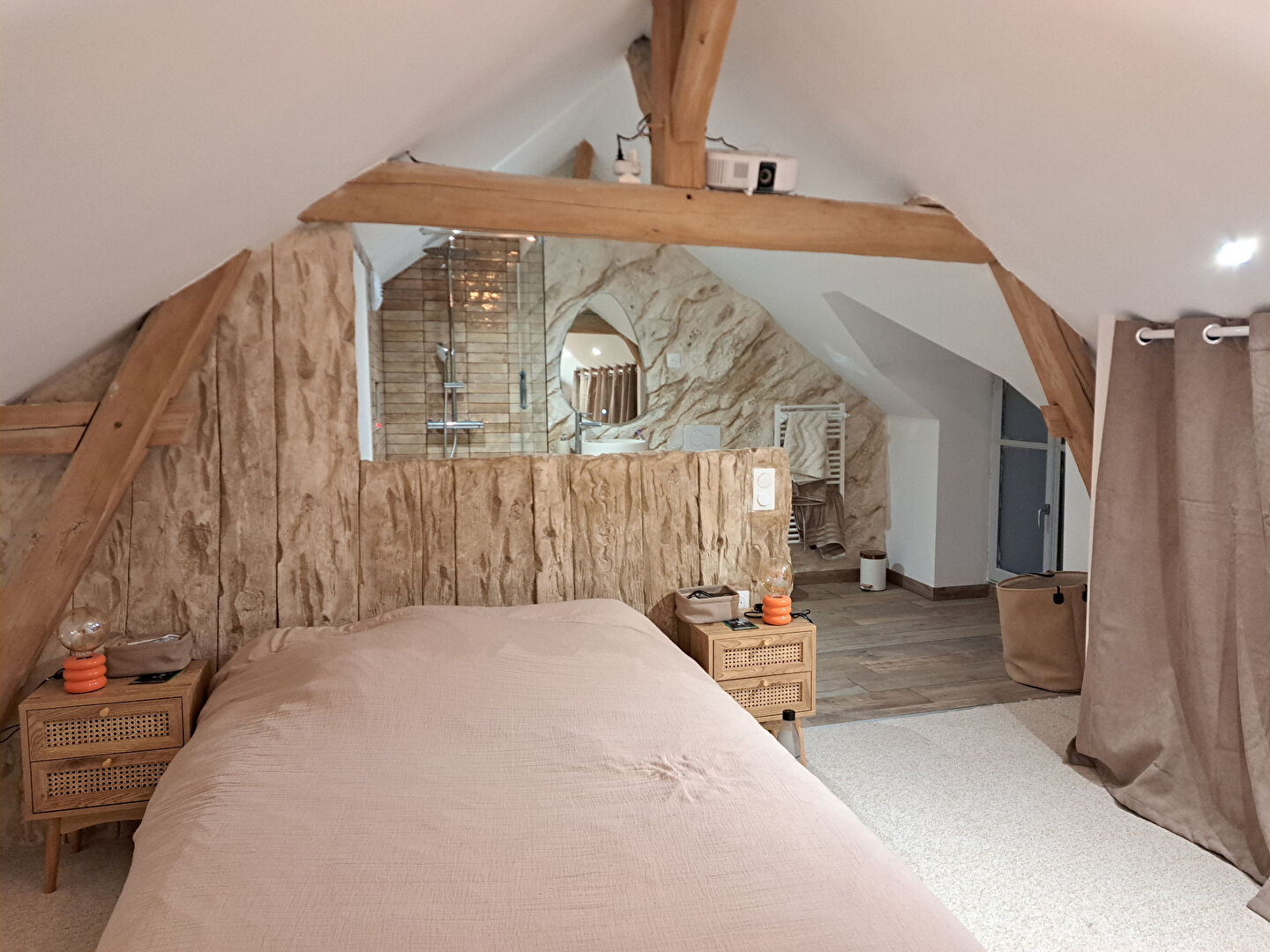 A l'étage une grande chambre mansardée avec salle d'eau et wc.