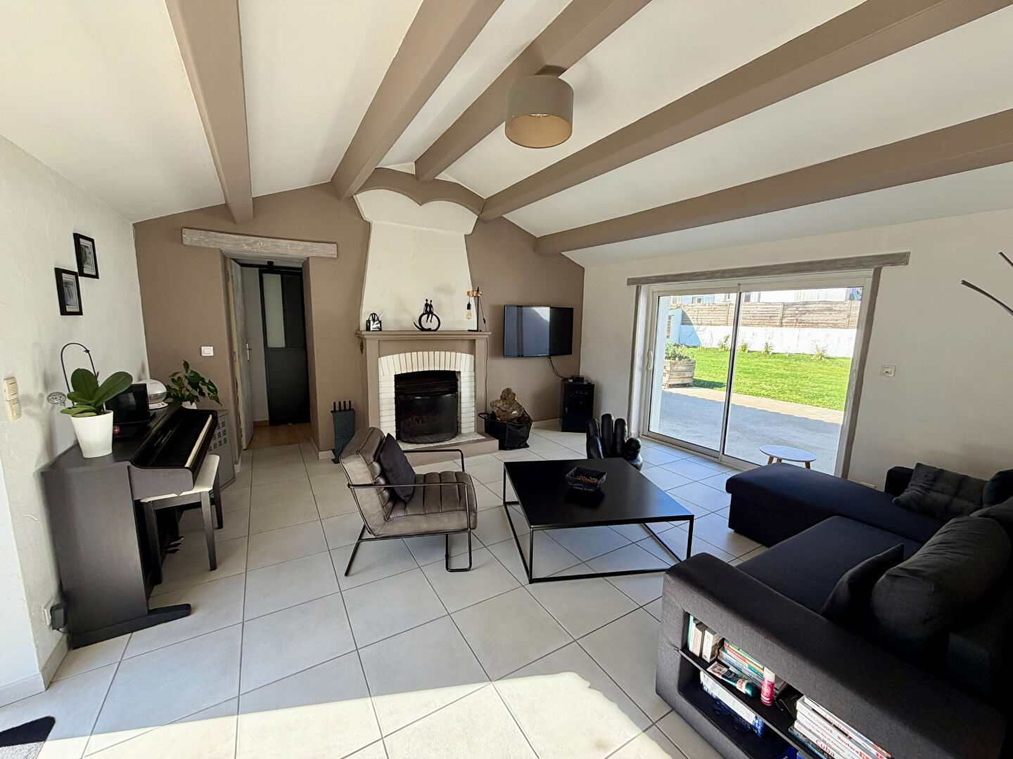 Dès l'entrée, le caractère opère : poutres apparentes, murs en pierre, volumes généreux et lumière traversante. La pièce de vie exposée plein Sud, avec son double séjour et sa cheminée insert, offre une atmosphère chaleureuse et conviviale.
