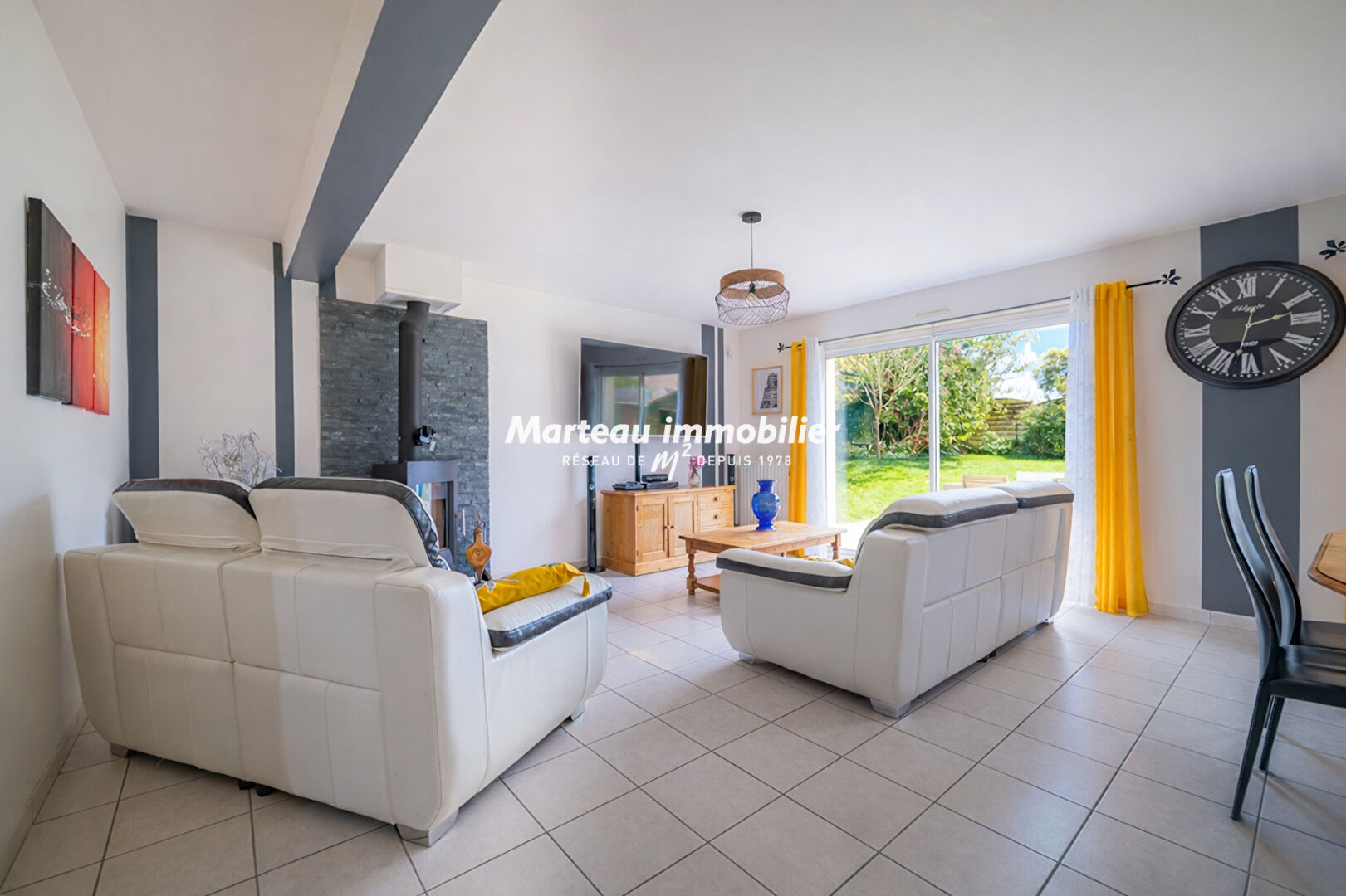 Salon-séjour lumineux avec poêle à bois, ouvert sur l'extérieur pour profiter de chaque moment.
