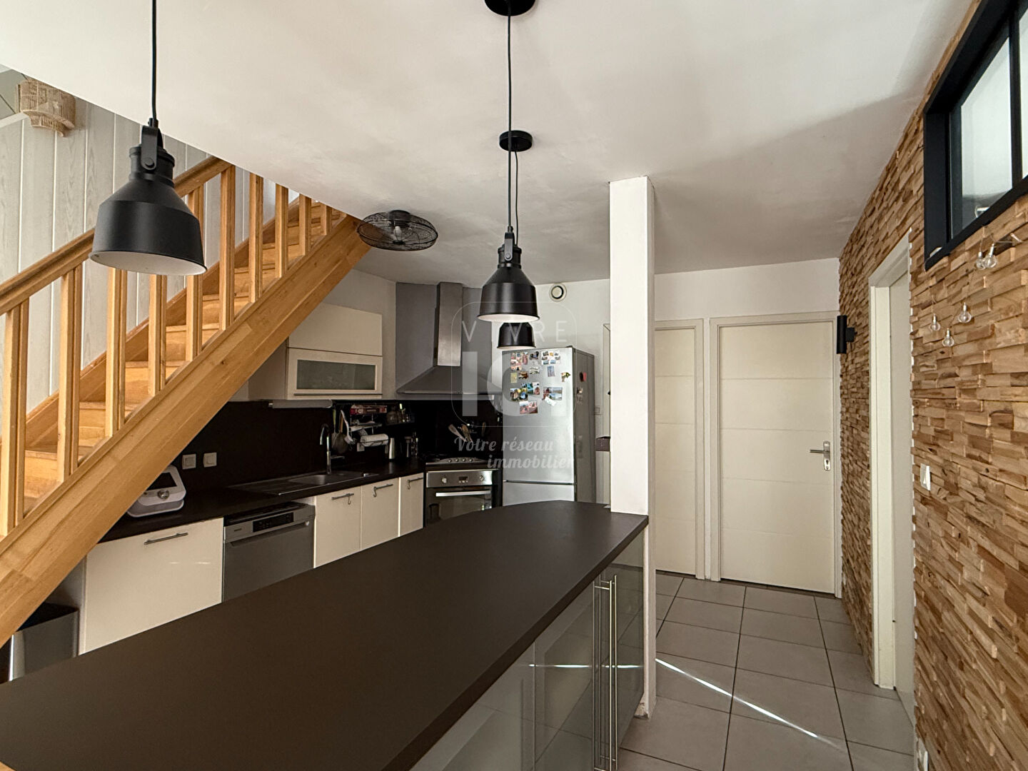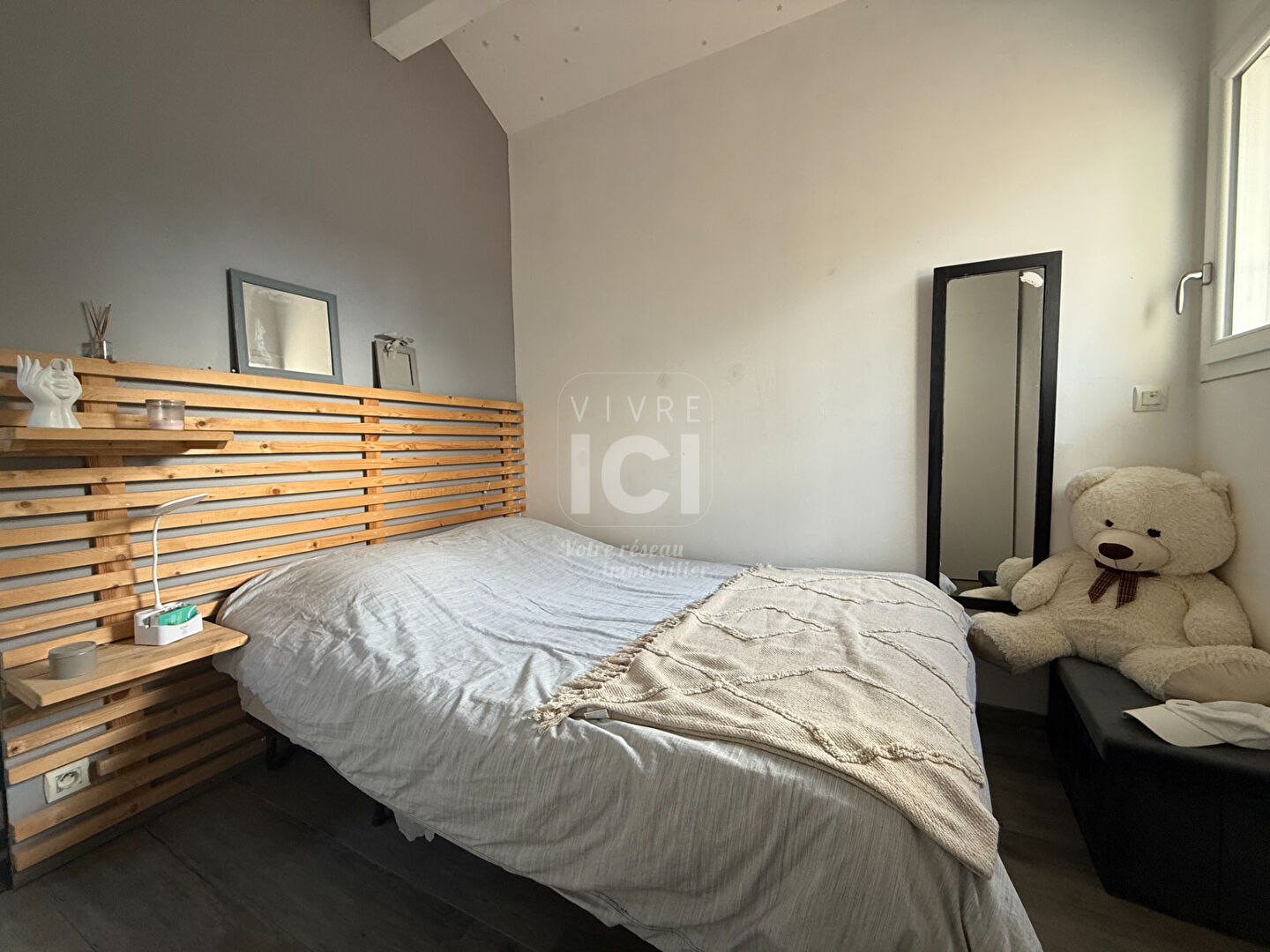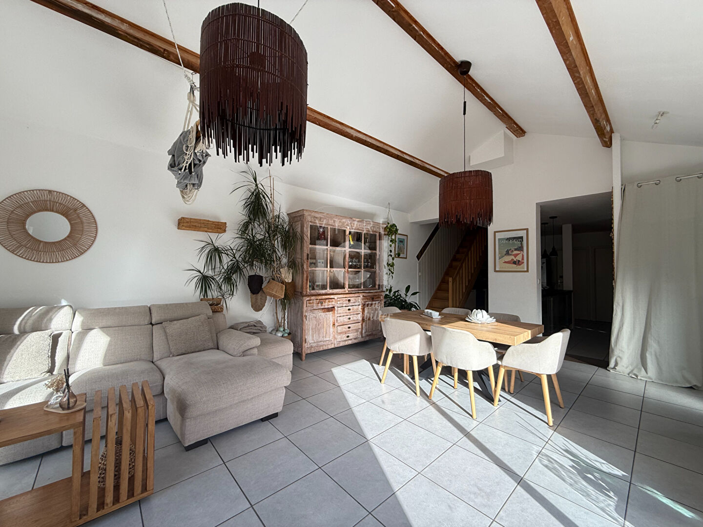Dès l'entrée, le rez-de-chaussée séduit par une agréable pièce de vie lumineuse, avec un séjour cathédrale exposé sud-ouest, idéal pour profiter pleinement de la lumière naturelle. La maison dispose également d'une cuisine aménagée, d'une suite parentale, d'un cellier et d'un WC indépendant.